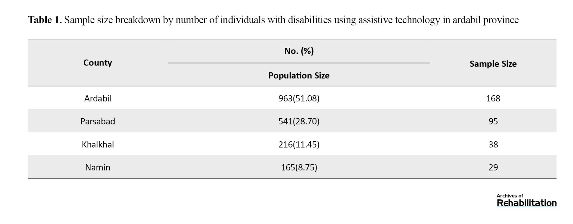 To ensure proper representation, coordination was made with the General Directorate of the Welfare Organization of Ardabil Province, Iran, and the study population was categorized according to the number of assistive technology users in four counties of Ardabil Province (cities of Ardabil, Parsabad, Khalkhal, and Namin). The sample distribution for each county is presented in Table 1.