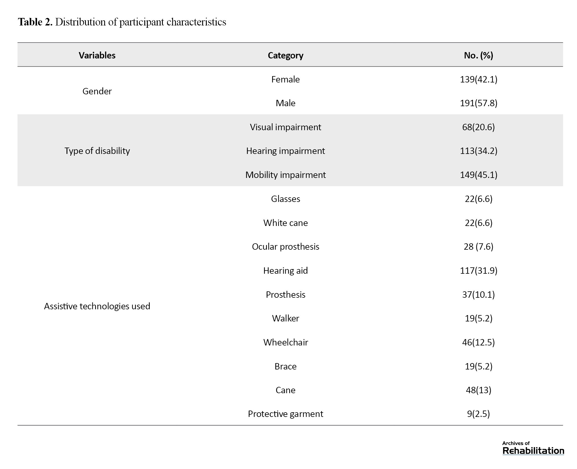 A total of 330 individuals participated in this study, 57.8% of whom were male. The participants’ Mean±SD age was 43±12.61 years . The largest age group was 31–40 years, representing 25.5% of the participants. Additionally, 45.1% of participants had mobility impairments, and 11.21% used more than two assistive technology devices. The distribution of participant characteristics is presented in Table 2.