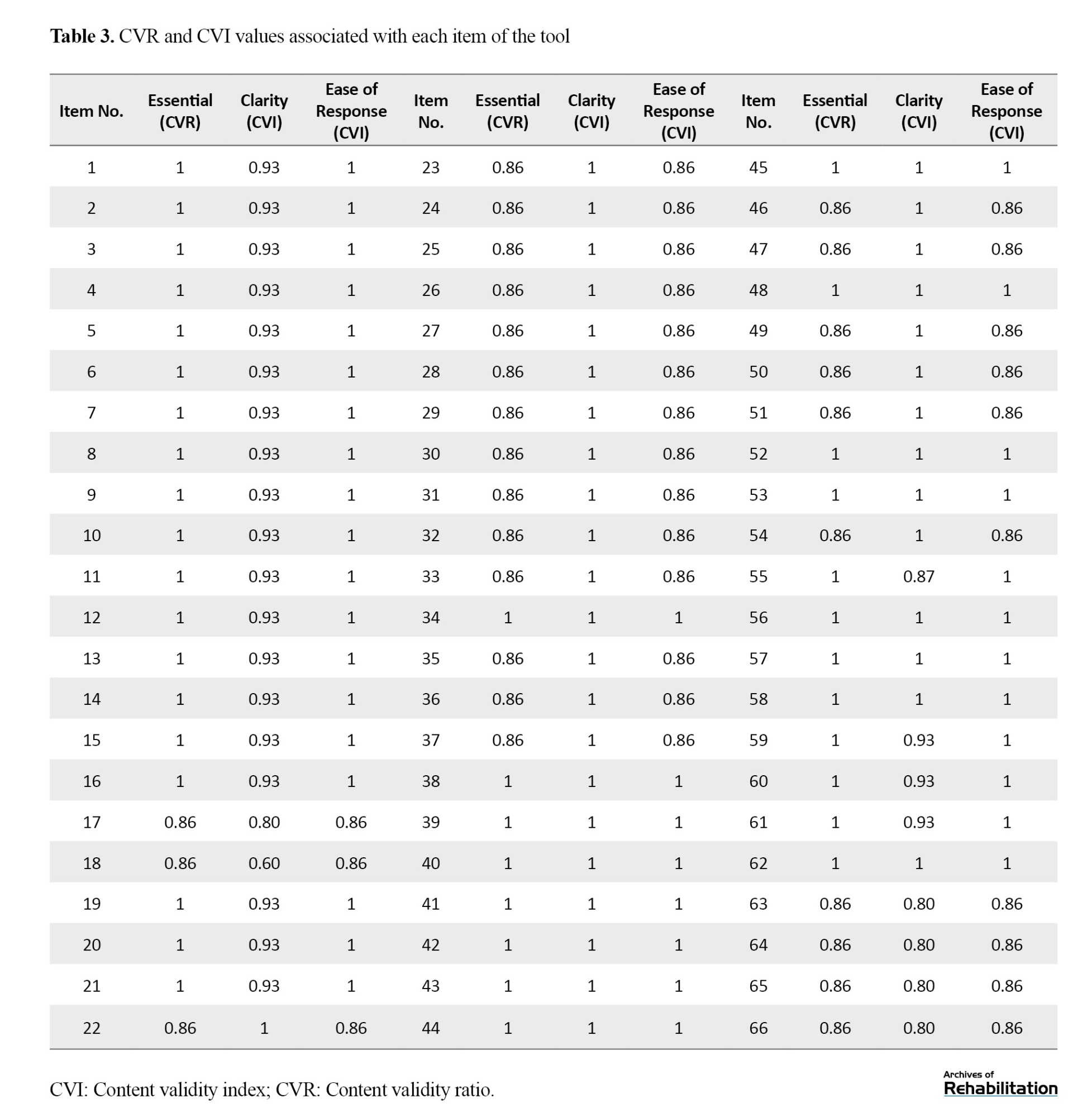 Two indices, namely content validity ratio (CVR) and content validity index (CVI), were used for quantitative content validity assessment. After collecting the survey questionnaires, expert feedback was analyzed statistically based on CVR and CVI values, resulting in modifications, such as item removal, addition, or revision. The Lawshe method was used to calculate the CVR and determine content validity [16]. Fifteen rehabilitation specialists evaluated the Persian version, rating each item as “essential,” “useful but not essential,” or “not necessary.” Experts also assessed each item’s clarity and relevance. Items with a CVR<0.49 were eliminated. For CVI assessment, specialists evaluated each item for clarity, simplicity, and relevance according to Waltz and Bausell’s guidelines [17]. The percentage of experts selecting the top two categories was then calculated. Items scoring <0.70 were rejected, those between 0.70 and 0.79 required revision, and those >0.79 were deemed acceptable.