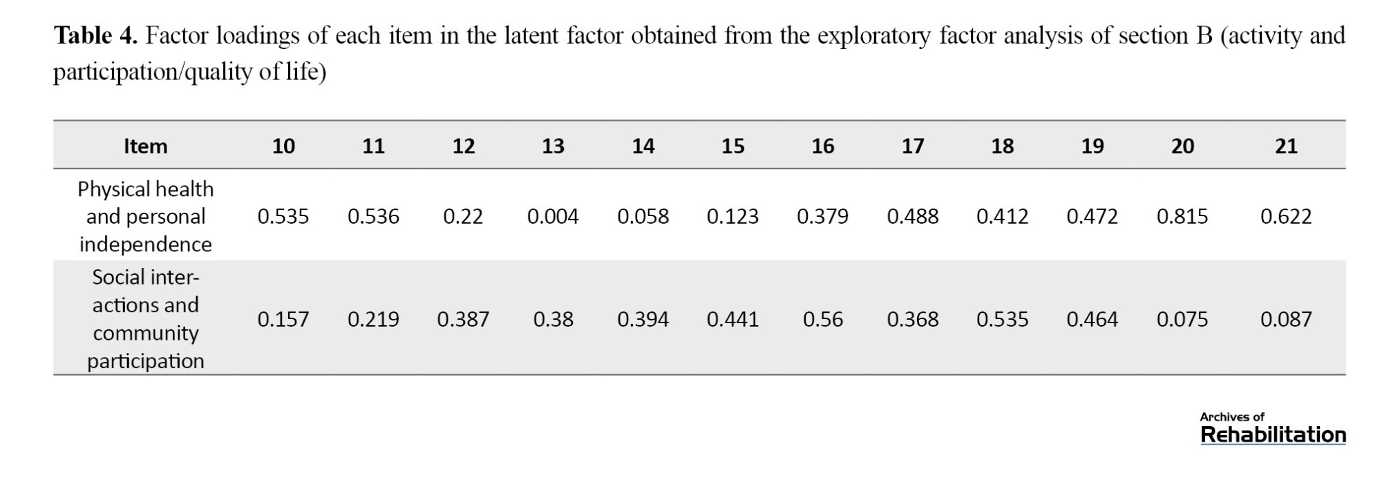 Exploratory factor analysis for Section B (activity and participation or quality of life) of the questionnaire, consisting of 12 items, was conducted using the maximum likelihood method with varimax rotation. The analysis identified two latent factors: physical health and personal independence, and social interactions and community participation. The Kaiser-Meyer-Olkin measure for this section was 0.884, indicating adequate data for factor analysis. Additionally, the Bartlett test (χ²=973.03, P<0.001) confirmed significant correlations among the items. Based on these findings, the two identified factors accounted for 34.5% of the total variance, with Factor 1 explaining 20.3% and Factor 2 explaining 14.2%. The item loadings for each factor are presented in Table 4.