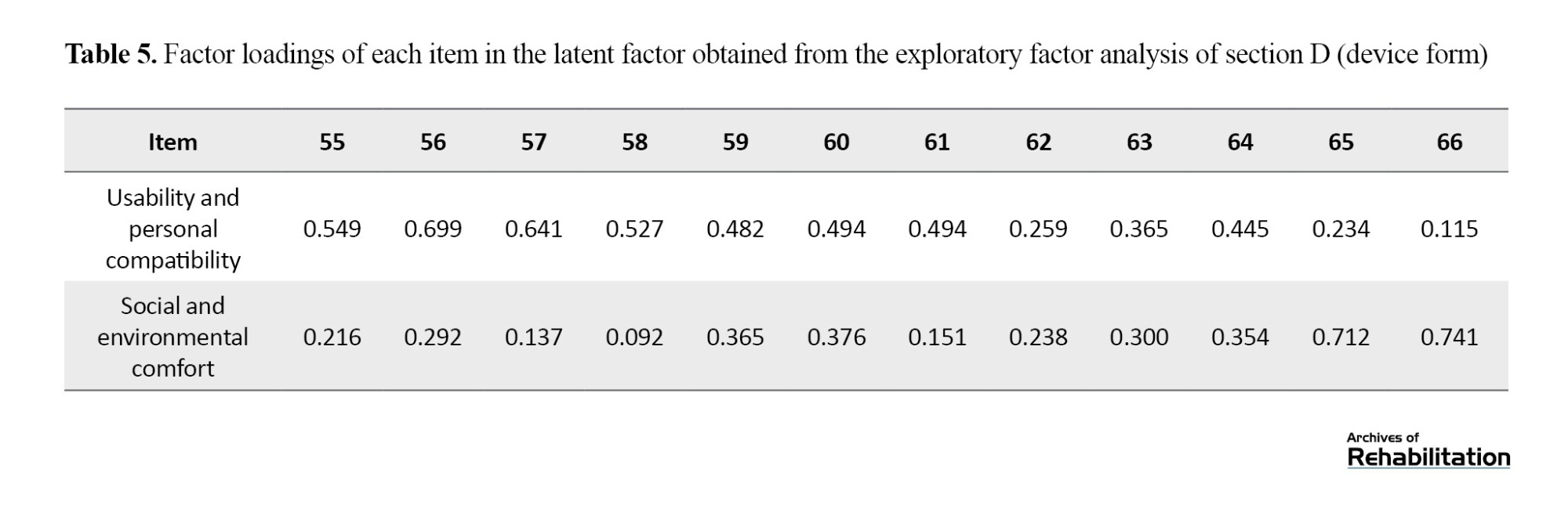 Exploratory factor analysis for Section D (device form) of the questionnaire, consisting of 12 items, was performed using the maximum likelihood method with varimax rotation. The analysis identified two latent factors: usability and personal compatibility, and social and environmental comfort. The Kaiser-Meyer-Olkin value for this section was 0.865, indicating the adequacy of the data for factor analysis. Additionally, Bartlett’s test (χ²=1066.96, P<0.001) showed significant correlations among the items. Based on the results, the two identified factors explained 37.1% of the total variance in the scores, with the first factor explaining 22.3% and the second factor explaining 14.8%. The items for each factor and their factor loadings are presented in Table 5.