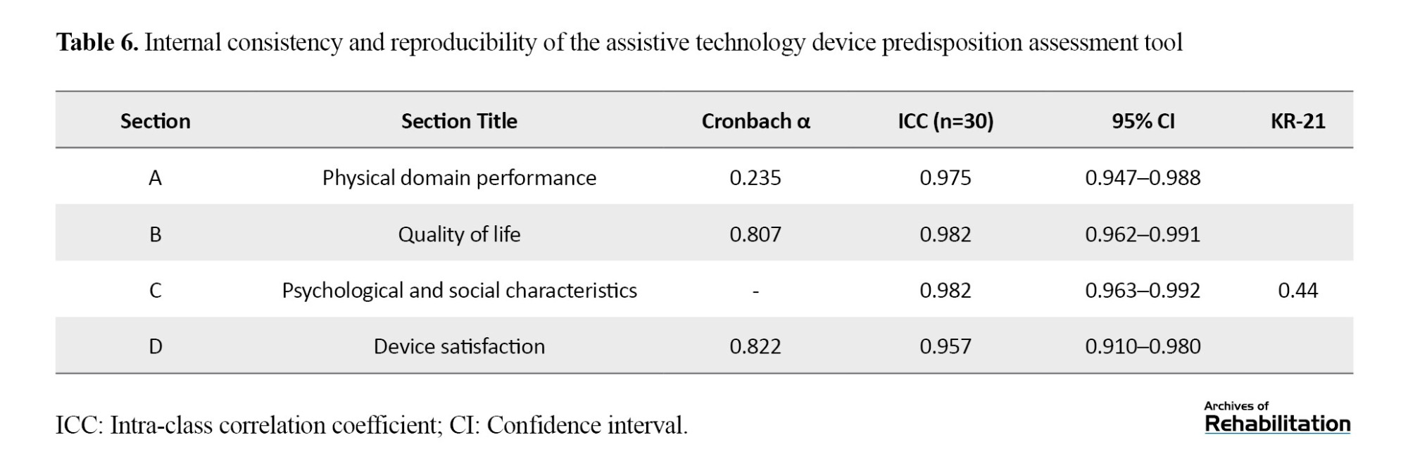 In the final stage, test-retest reliability was assessed by having 30 individuals with disabilities complete the questionnaire again after two weeks. The intraclass correlation coefficient (ICC) was then calculated with a 95% confidence interval (CI).