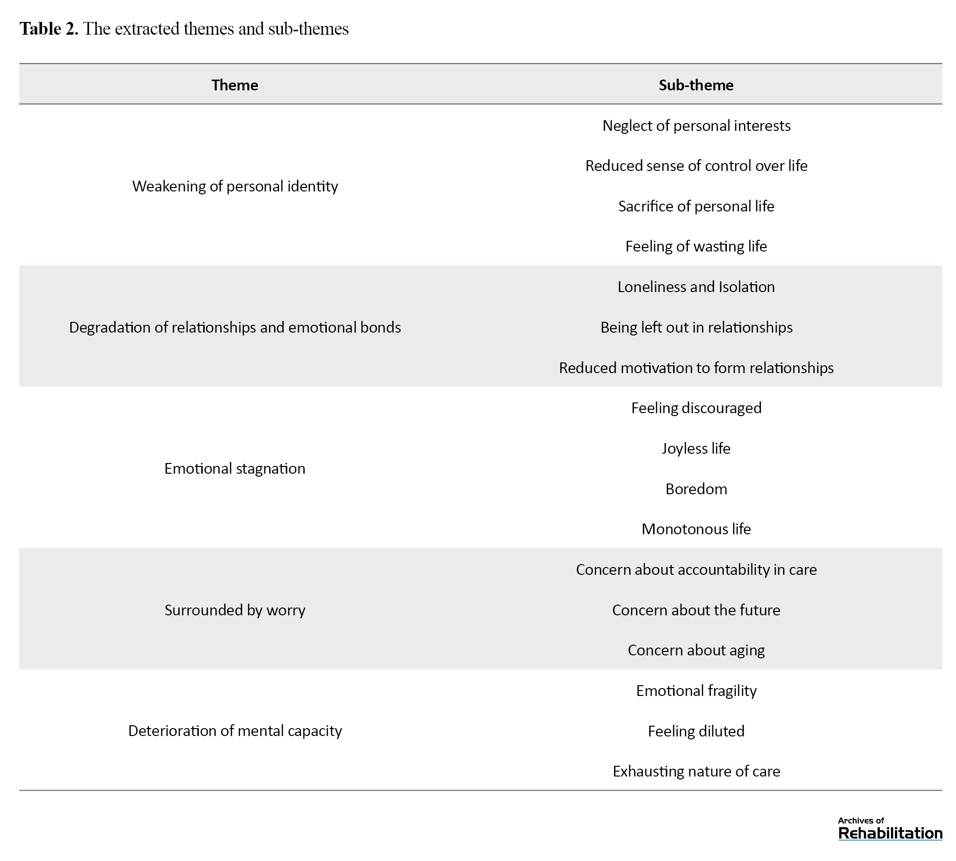 The first theme was “Weakening of personal identity”. This theme consisted of four sub-themes: Neglect of personal interests, reduced sense of control over life, sacrifice of personal life, and feeling of wasting life.