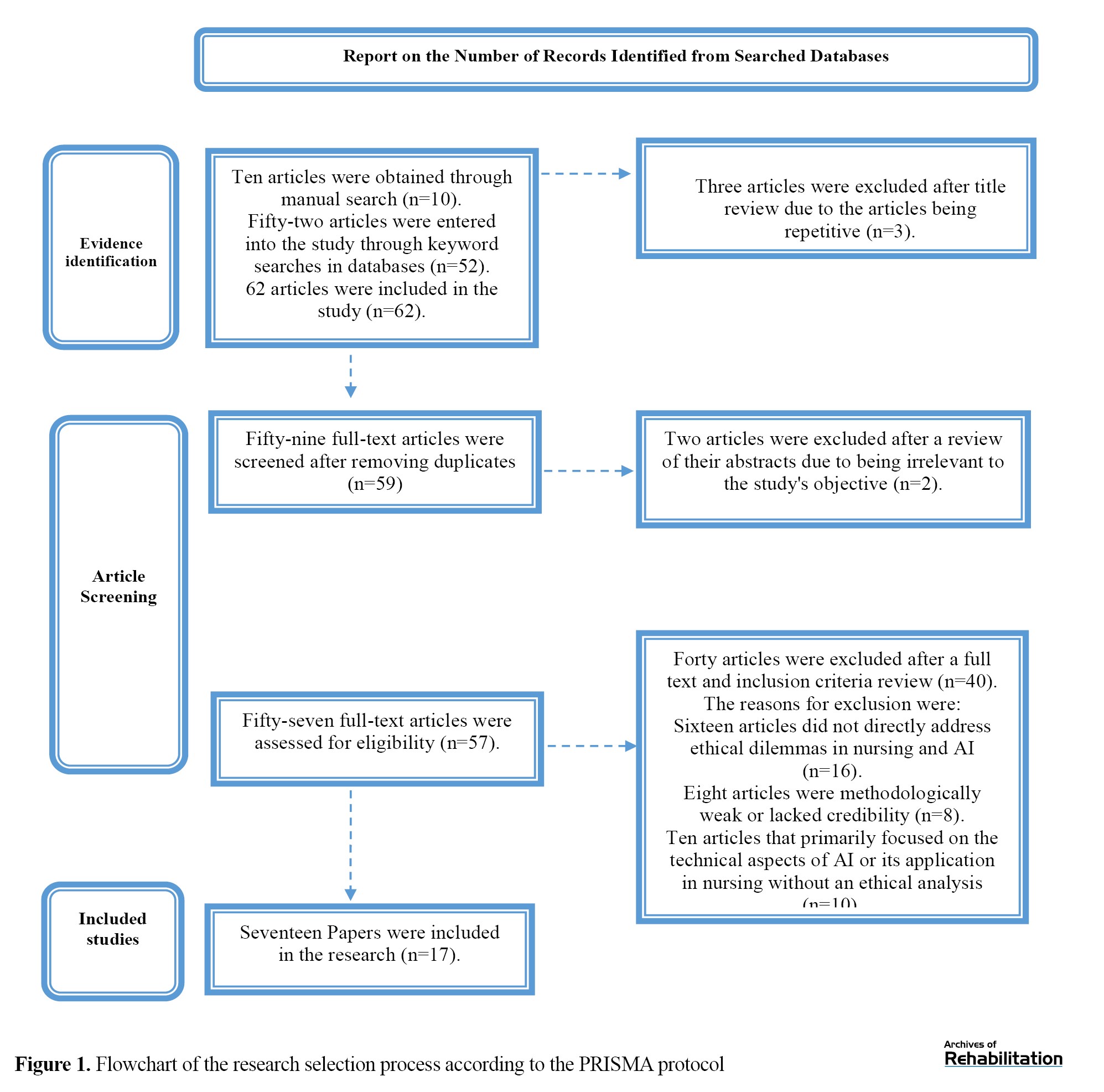 Exclusion criteria: Articles that did not directly address ethical dilemmas in nursing and AI; those that were methodologically weak, lacked credibility, or provided unreliable results; articles focusing primarily on the technical aspects of AI or its application in nursing without ethical analysis; and articles written in languages other than Persian or English.