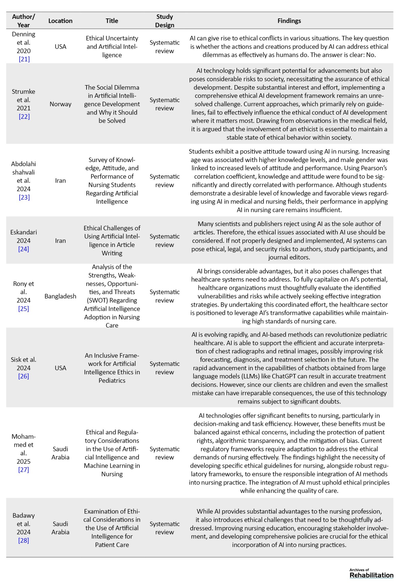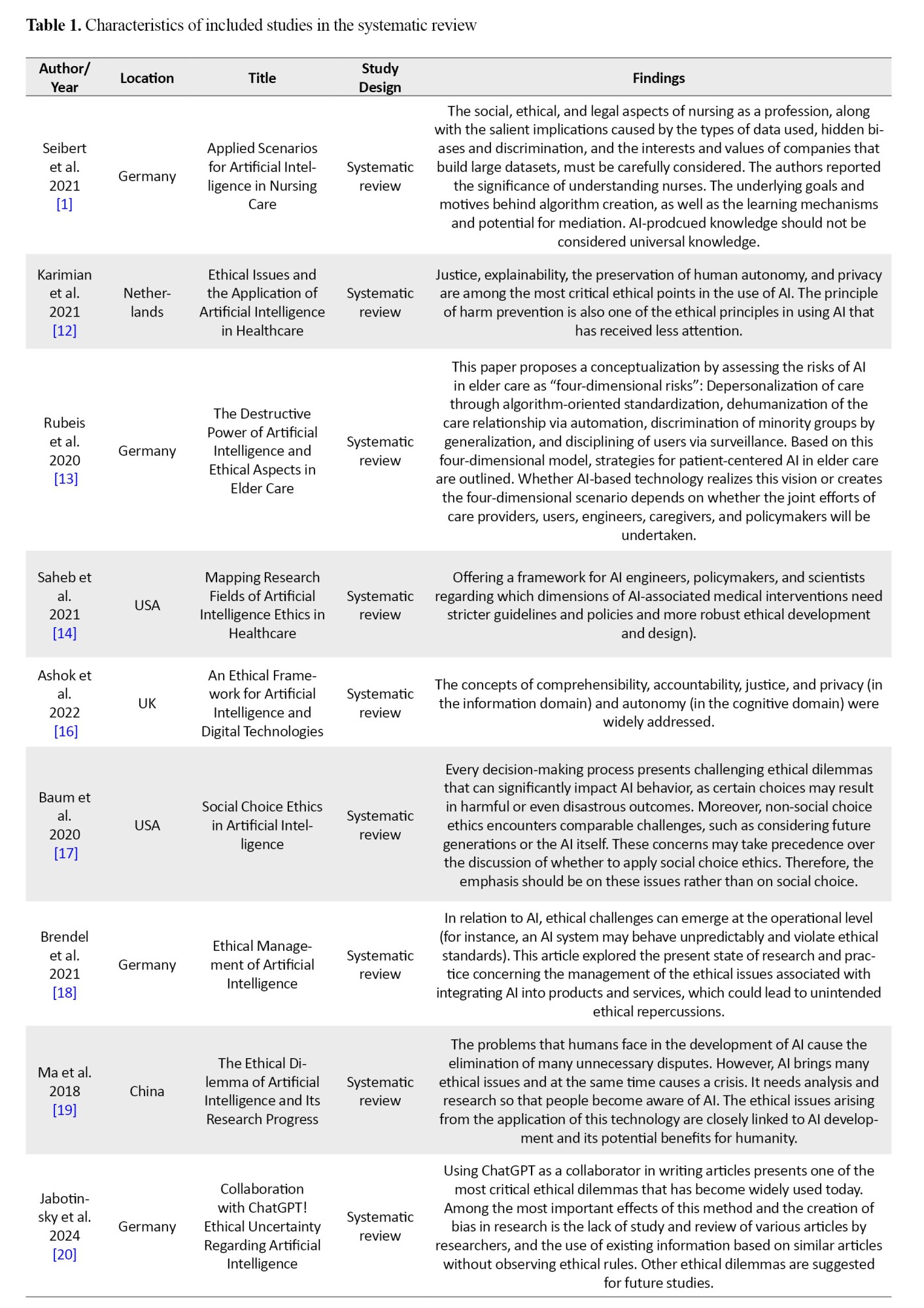 Inclusion crieria: Research studies, systematic reviews, analytical articles, and case reports that focused on AI technologies and their application in nursing (particularly concerning ethical dilemmas) and provided relevant empirical data and evidence; articles published in either Persian or English; full-text articles available; and articles published from 2018 to 2025 to make sure of including the most recent data and findings.