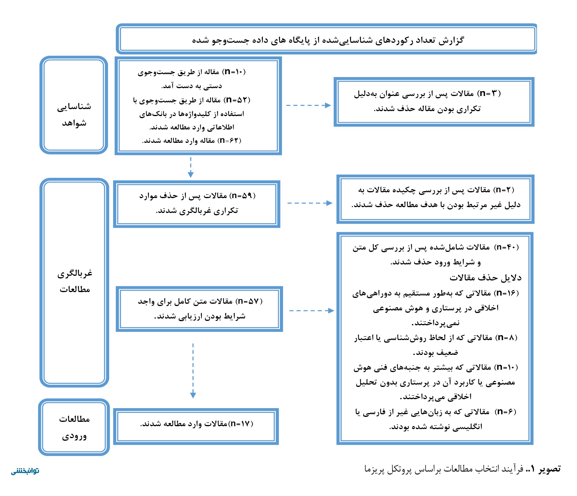 مقالاتی که به طور مستقیم به دوراهیهای اخلاقی در پرستاری و هوش مصنوعی نمیپردازند ؛مطالعاتی که از لحاظ روششناسی یا اعتبار ضعیف هستند یا نتایج غیرقابلاستناد دارند؛ مقالاتی که بیشتر به جنبههای فنی هوش مصنوعی یا کاربرد آن در پرستاری بدون تحلیل اخلاقی میپردازند؛ مقالاتی که بیشتر به جنبههای فنی هوش مصنوعی یا کاربرد آن در پرستاری بدون تحلیل اخلاقی میپرداختند و مقالاتی که به زبانهایی غیر از فارسی یا انگلیسی نوشته شدهاند.