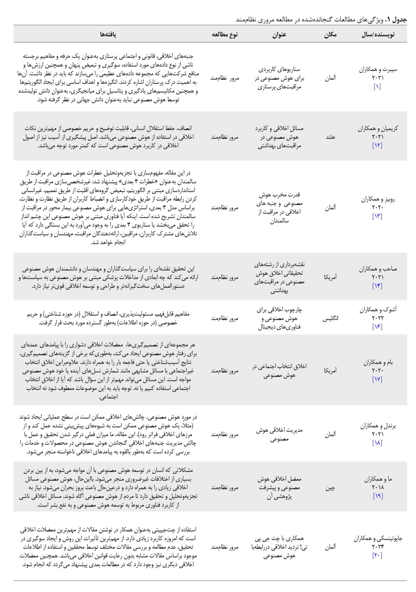 جدول شماره 1 نشان داده شده است. استفاده از هوش مصنوعی در مراقبتهای سلامت، چالشهای اخلاقی متعددی را به همراه دارد که باید مدنظر قرار گیرند.