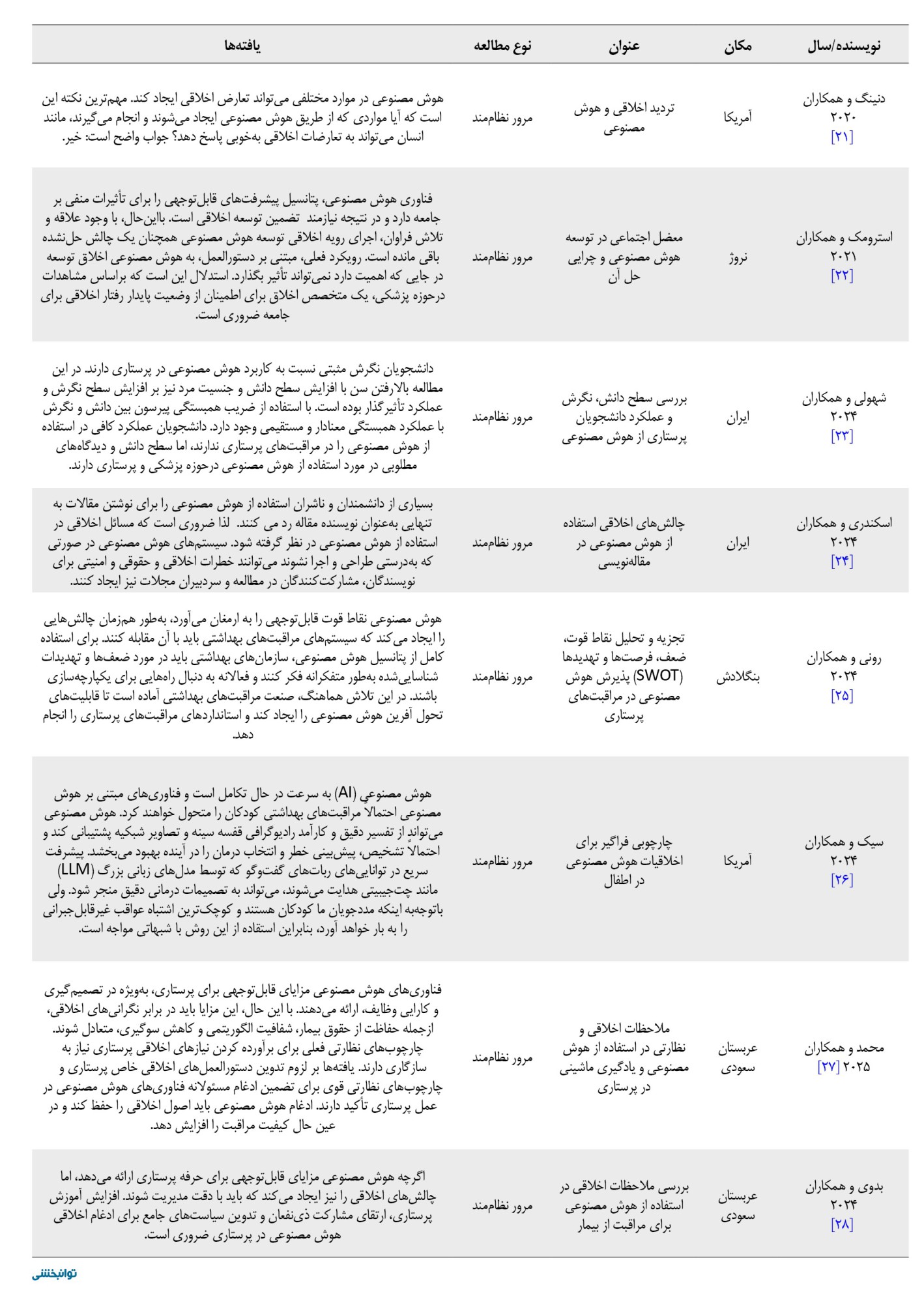 مطالعات مرتبط با هوش مصنوعی و کاربرد آن در حوزه پرستاری-بهویژه در زمینه دوراهیهای اخلاقی- مطالعات پژوهشی، مرور نظاممند، مقالات تحلیلی، و گزارشهای موردی که به مسائل اخلاقی در پرستاری و فناوریهای هوش مصنوعی پرداختهاند؛
