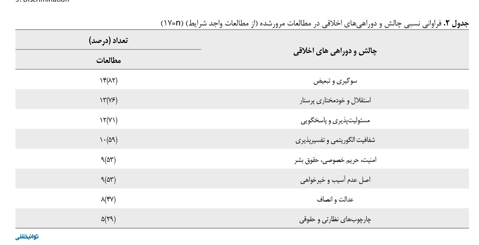 موضوع شفافیت الگوریتمی و تفسیرپذیری در 10 مطالعه (59 درصد) بررسی شده است. دو محور امنیت، حریم خصوصی و حقوق بشر و اصل عدم آسیب و خیرخواهی هر کدام در 9 مطالعه (53 درصد) گزارش شدهاند. عدالت و انصاف با 8 مطالعه (47 درصد) و درنهایت چارچوبهای نظارتی و حقوقی با 5 مطالعه (29 درصد) کمترین فراوانی را در میان فراوانی نسبی چالش و دوراهی های اخلاقی داشتهاند.