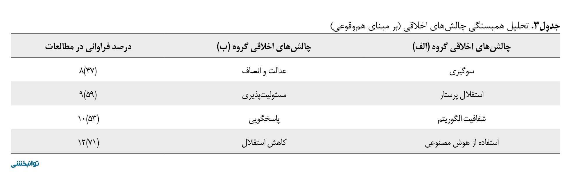 جدول شماره 3 تحلیل همبستگی چالشهای اخلاقی (بر مبنای هموقوعی) آورده شده است.