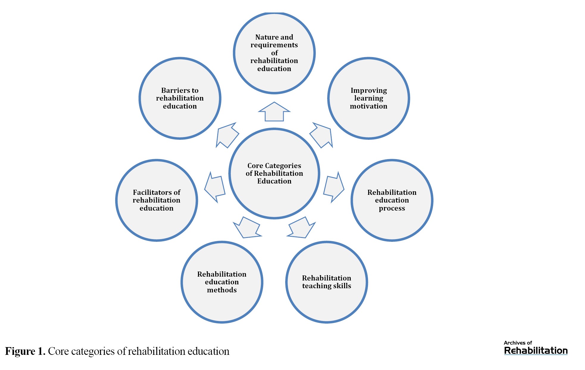 There are a few studies in the field of rehabilitation education in Iran. The distinctive nature of rehabilitation (underlying beliefs) and its educational requirements (methods, tools, and facilities necessary for effective training) warrant further investigations. This study seeks to address the following questions: How is the rehabilitation education process? and what conceptual model best represents rehabilitation education? Using a grounded theory approach, this study aims to develop a context-specific and practical model for both theoretical and practical rehabilitation education based on the perspectives of individuals directly involved in rehabilitation education.