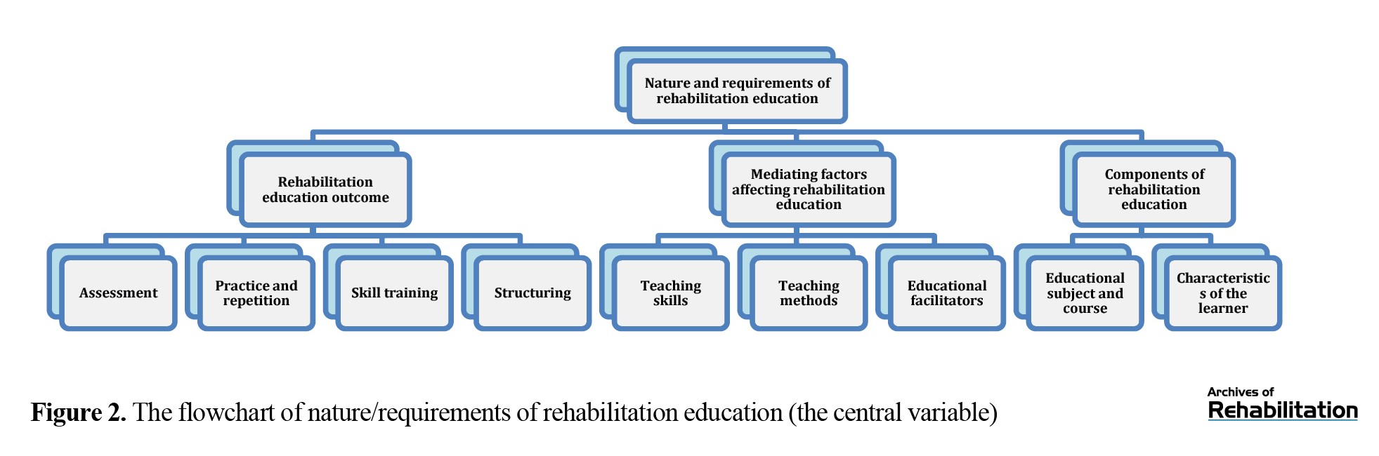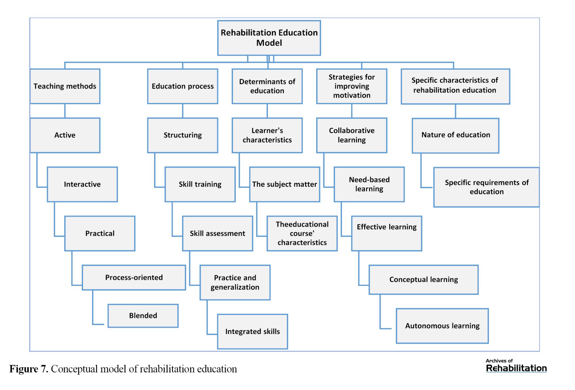 The conceptual paradigms derived from the analysis in this study were organized based on this central category. In this model, the nature and requirements of rehabilitation education included the components, mediating factors, and outcomes of rehabilitation education.