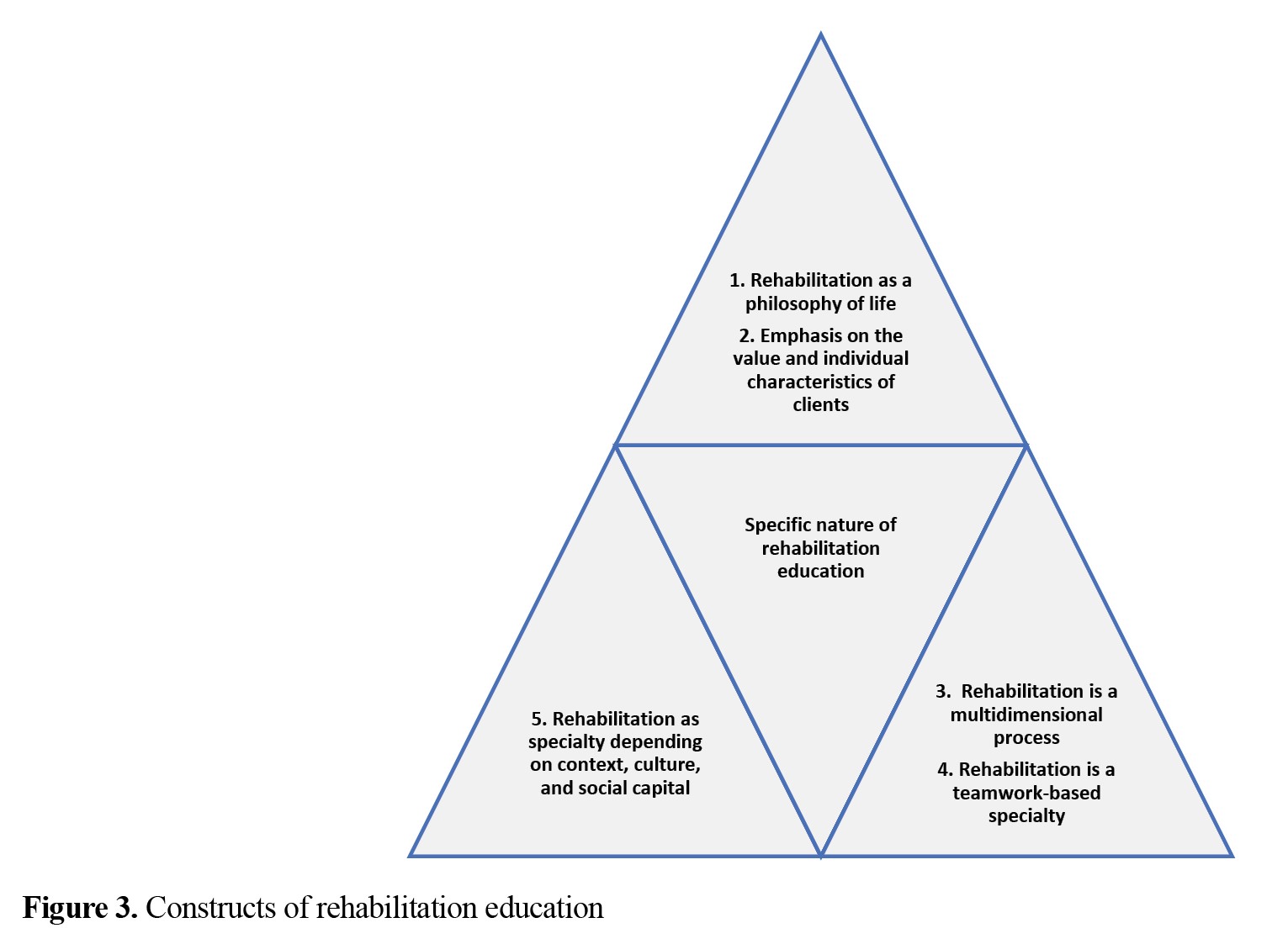 For optimal rehabilitation education, active learning methods, practical training, teamwork, collaborative learning, coordinated teaching, skill training, a conceptual map of education, focusing on education strategies, and a coherent curriculum are important. Improvement in the learning process is closely related to learners’ motivation and interest, which is affected by effective communication among educational stakeholders and learners’ positive attitudes toward rehabilitation. Educational tools, particularly digital technologies, play an important role in enhancing rehabilitation education, and blended and multidimensional learning is an effective factor in improving rehabilitation education. The main constructs shaping the nature of rehabilitation education are focused on the centrality of the client, the multidimensionality of education, and the need for teamwork dependent on cultural and local contexts.
