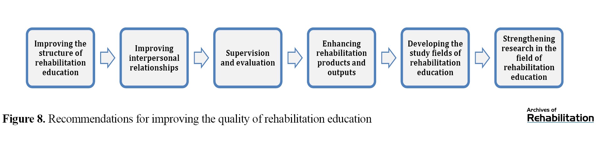 1) defining the structure of rehabilitation education and devoting a branch of higher education to rehabilitation education. 2) developing detailed educational protocols for rehabilitation work with people in need of these services. 3) focusing on the components of rehabilitation education and developing comprehensive and equity-oriented rehabilitation programs. 4) utilizing modern rehabilitation teaching methods. 5) applying the novel education methods for improving learning motivation. 6) new planning and policymaking focused on addressing the problems of rehabilitation education. 7) improving rehabilitation skill training during the education process. 8) applying the specific requirements of rehabilitation education in the teaching process.