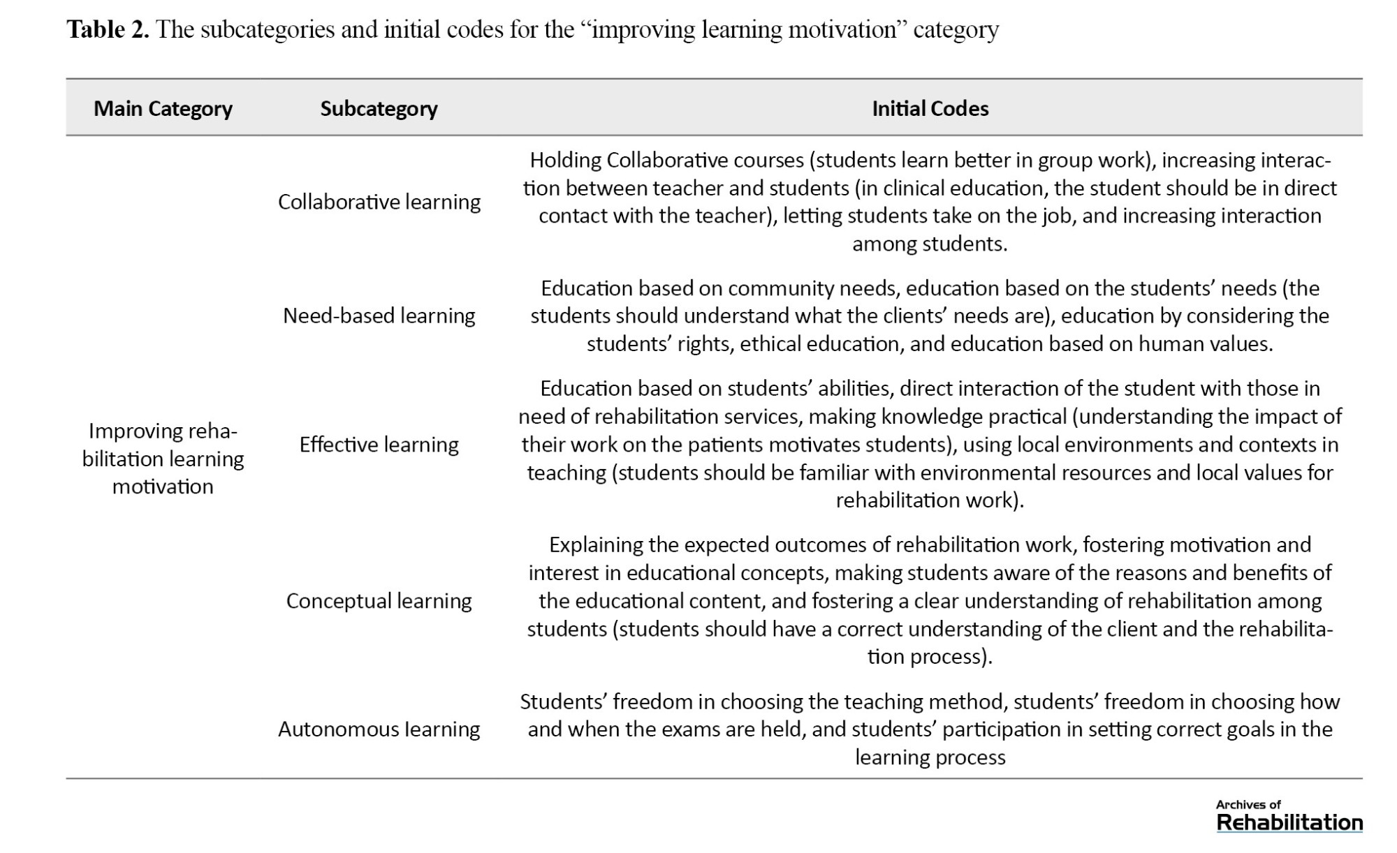 The category of improving motivation for learning rehabilitation had six sub-categories: Collaborative learning, need-based learning, effective learning, knowledge-oriented learning (education for accurate and deep understanding of concepts), autonomous learning (recognizing the student’s right to choose the study subject, process, and product), and strengthening positive self-related constructs (