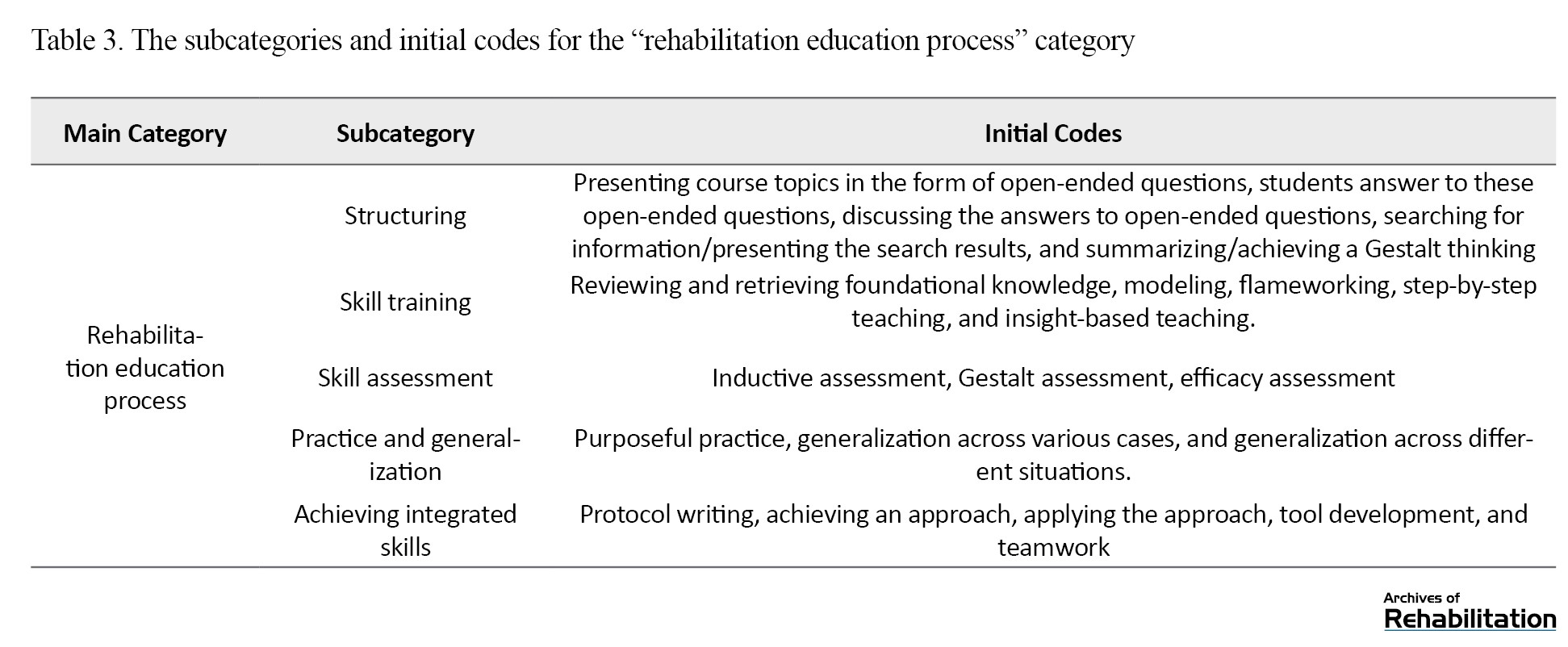 Table 3 summarizes the subcategories and their initial codes that contribute to the process of rehabilitation education.