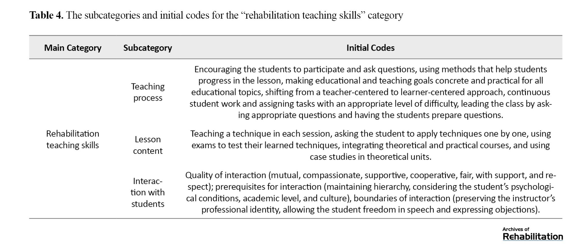 This study was conducted using a grounded theory approach. Participants included faculty members and doctoral students in rehabilitation sciences from the University of Social Welfare and Rehabilitation Sciences. Sampling was done using a purposive method. Sampling continued until data saturation, which was achieved after 32 interviews. The inclusion criteria for faculty members included at least five years of teaching experience related to rehabilitation courses and willingness to participate in the study. The Inclusion criteria for students were the study or teaching experience in one of the rehabilitation disciplines, as well as willingness to participate in the study. The faculty members included two occupational therapists with 20 years of teaching experience, five physiotherapists with 22 years of teaching experience, three speech-language therapists with 17 years of experience, two social workers with 15 years of experience, two rehabilitation management specialists with 25 years of experience, and four prosthetics and orthotics specialists with 12 years of teaching experience. In addition, 14 doctoral students in occupational therapy, speech therapy, and physiotherapy were included in the study.