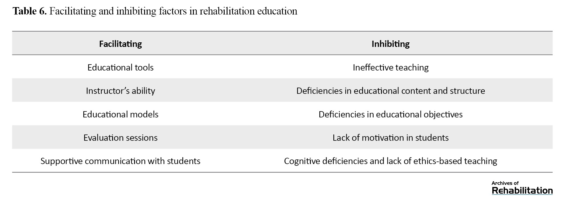 The use of up-to-date and efficient educational tools, the instructor’s ability in teaching, presentation of effective educational models, periodic and comprehensive evaluations, and supportive, professional, and warm instructor–student interactions were among the factors that facilitate rehabilitation education. In contrast, ineffective and inefficient teaching, deficiencies in educational content and objectives, lack of student motivation, insufficient knowledge, and the lack of ethics-based teaching were barriers to rehabilitation education (