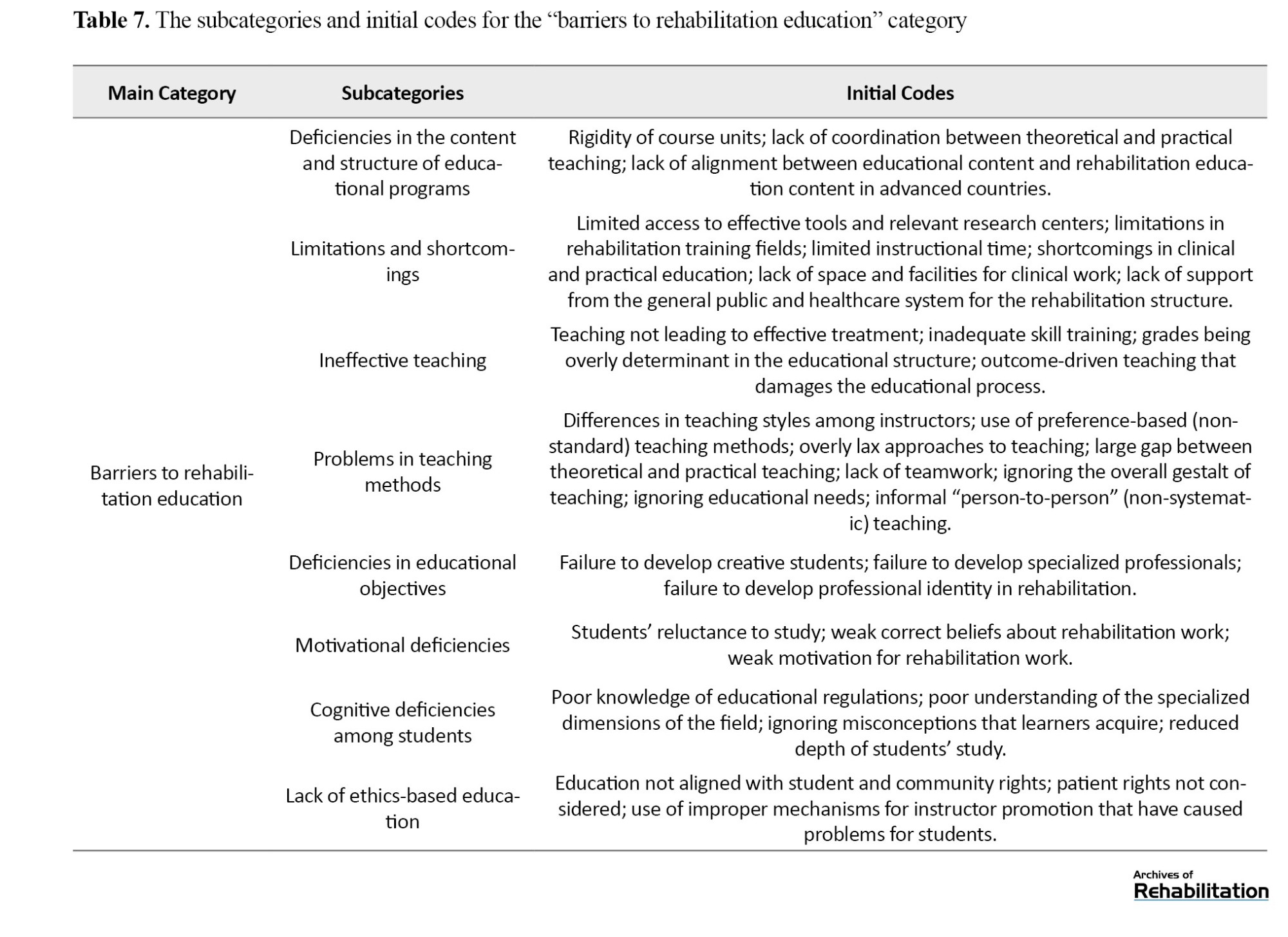 Table 7 summarizes the initial codes that contribute to the barriers to rehabilitation education.