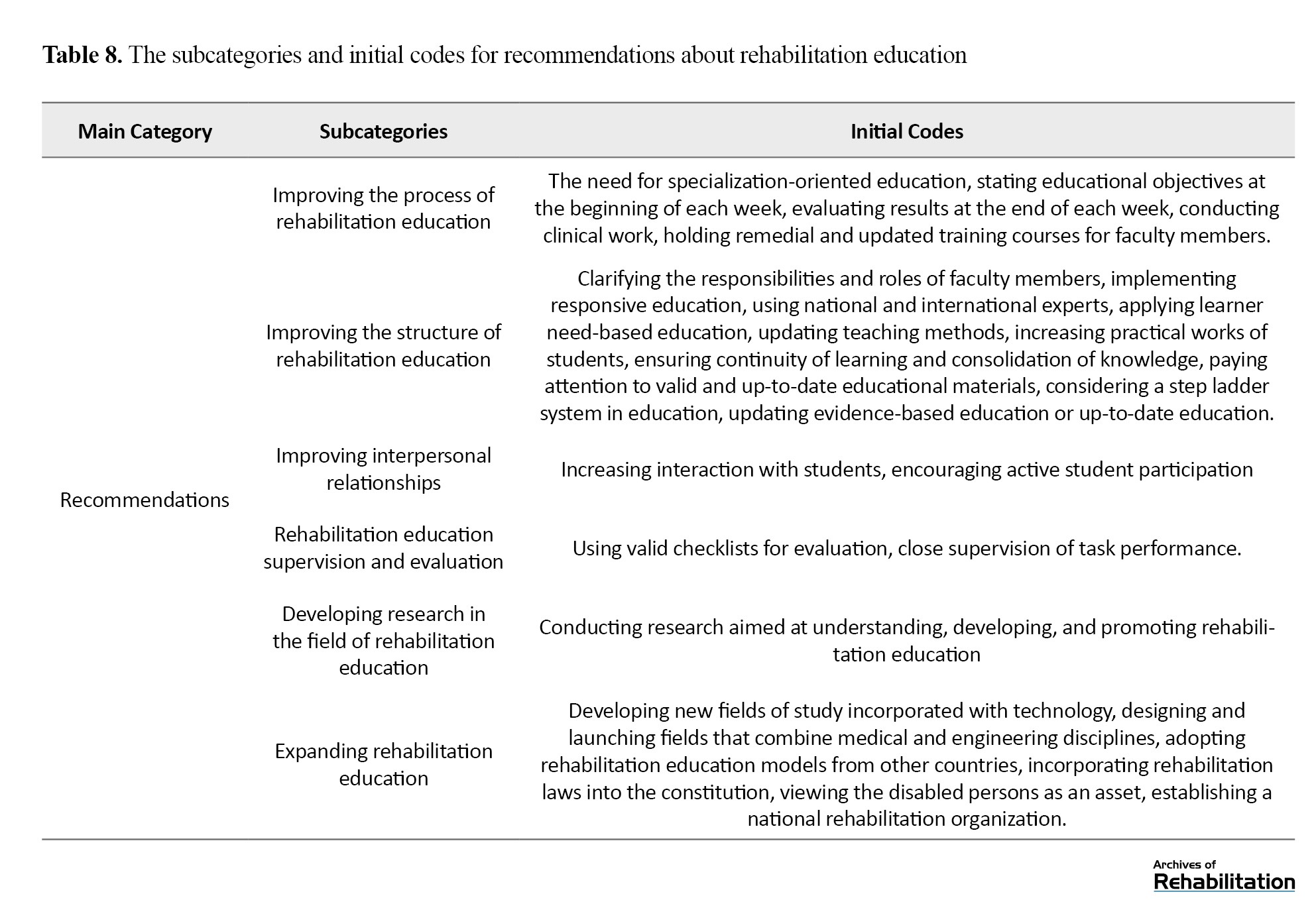 These categories focus on improving the rehabilitation education process, structure, monitoring and evaluation, and strengthening research in the field of rehabilitation education in Iran and the expansion of rehabilitation education.