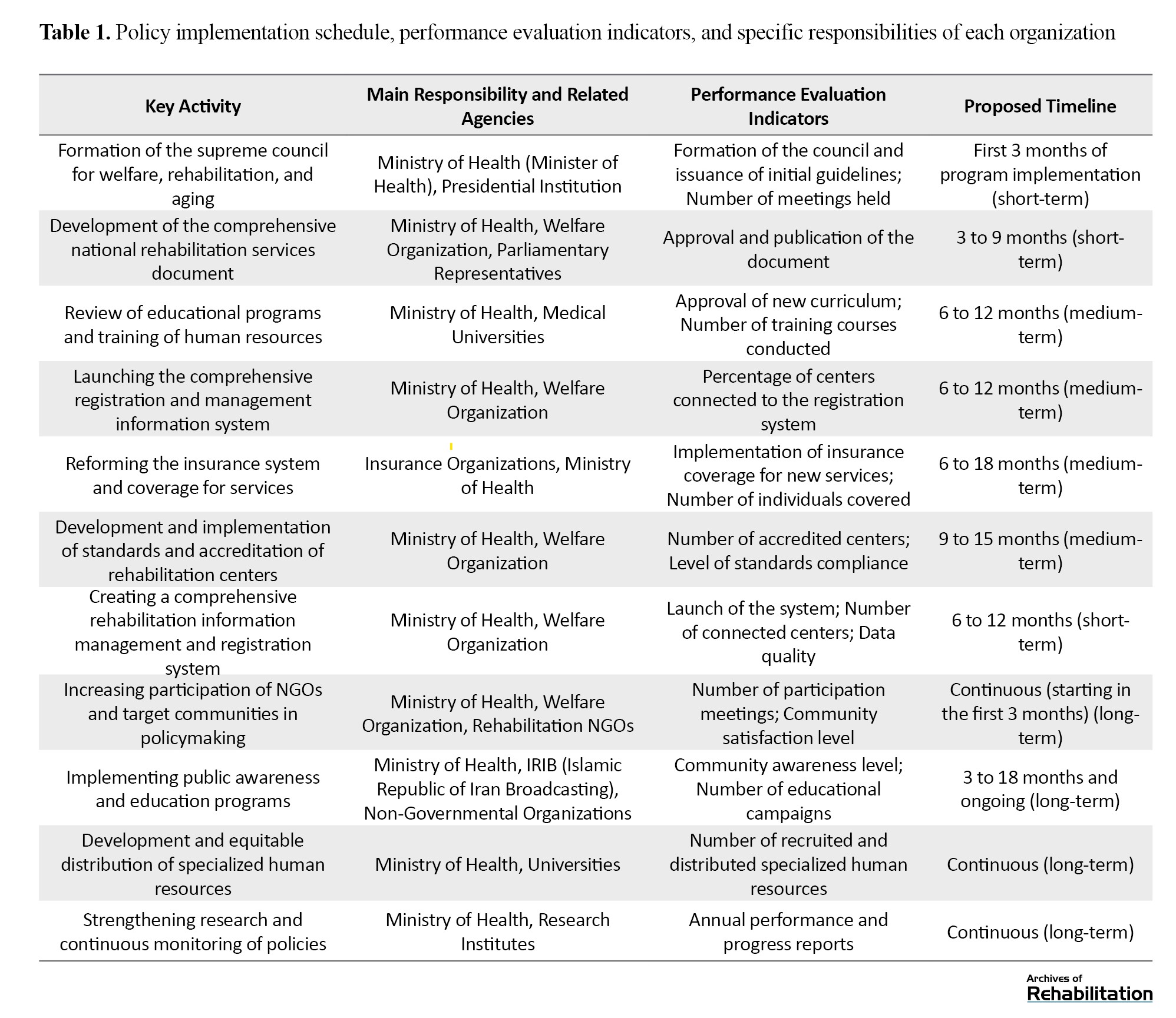 1) Formation and activation of the Supreme Council for Welfare, Rehabilitation, and Aging, with an agenda focused on developing a comprehensive document, inter-sectoral coordination, and continuous supervision of policy implementation; 2) planning and execution of revised educational programs in medical universities, emphasizing interdisciplinary rehabilitation skills and the training of specialized human resources; 3) reforming the payment and insurance system for rehabilitation services by defining specific service packages and ensuring timely payments to service-providing centers; 4) establishing transparent legal and supervisory mechanisms through the development of regulations, implementation of center accreditation, and formation of follow-up and accountability committees; 5) launching a comprehensive rehabilitation information registration system in collaboration with relevant agencies to register patient status, services, and rehabilitation centers; 6) providing government financial support and incentive policies to expand services in both public and non-public sectors, as well as to develop assistive and knowledge-based technologies; 7) enhancing stakeholder and community participation through the formation of specialized associations and widespread public education to promote a culture of support for individuals with disabilities; 8) the implementation of these actions requires the allocation of sufficient resources, the creation of cohesive management structures, and continuous supervision by responsible agencies. The proposed schedule for policy implementation, performance evaluation indicators, and specific responsibilities of each agency is given in Table 1.