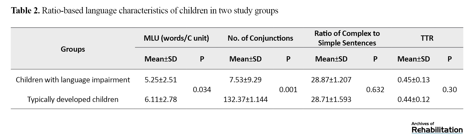 The correlation assessment of the syntactic and semantic indices with the OLA score showed that the highest correlations were observed for the number of conjunctions (r=0.26, P<0.001) and MLU (r=0.19, P=0.005), whereas the TTR did not show a statistically significant correlation.