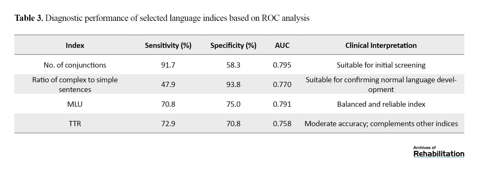 This matrix shows the number of children in each group who were correctly or incorrectly classified by each index. According to the results in this table, the ratio of complex to simple sentences exhibited the highest specificity (78%), making it more suitable for confirming normal language development. The number of conjunctions showed the highest sensitivity (73%), making it more effective for initial screening. The TTR demonstrated the weakest performance based on sensitivity and specificity, and therefore, it is not reliable for diagnosis on its own.
