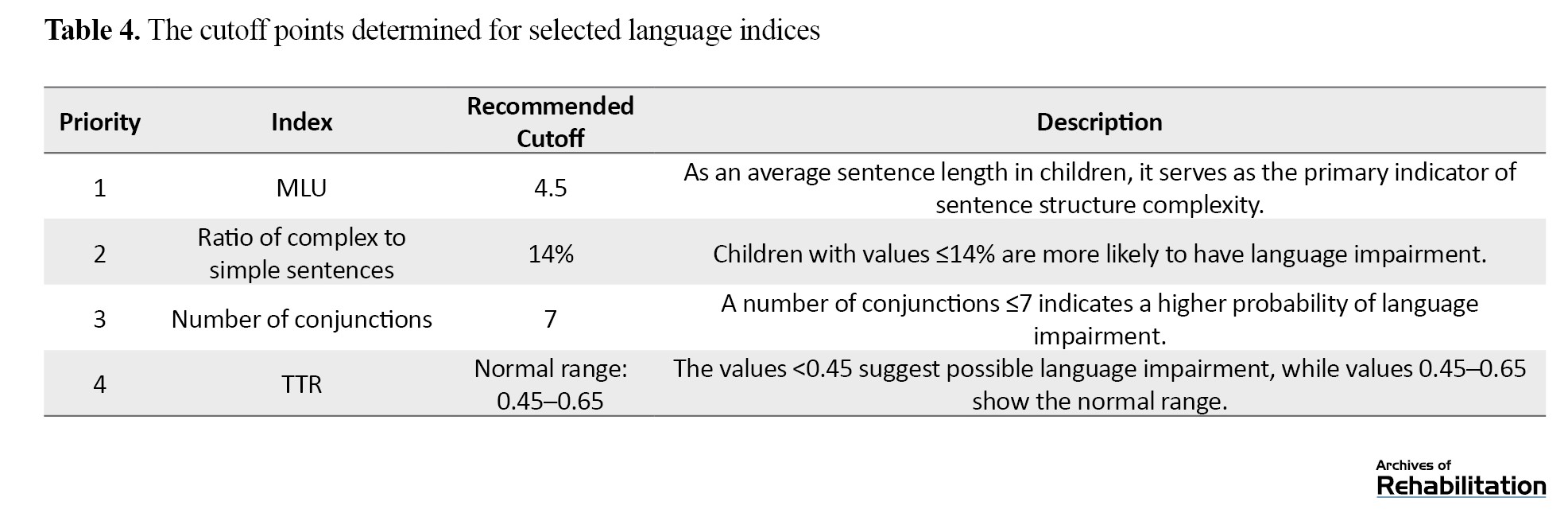 Table 4 presents the optimal cutoff points obtained for each language index, along with their descriptions.