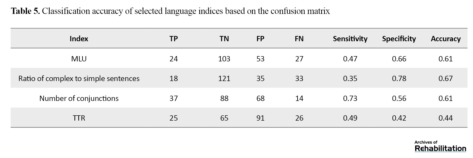To determine the cutoff point for each index, the Youden index (J=Sensitivity+Specificity–1) was used to achieve an optimal balance between sensitivity and specificity. Sensitivity and specificity were calculated based on a classification matrix for each index, using the following parameters: True positive (TP), i.e. the correct identification of a child with language impairment; false positive (FP), i.e. the incorrect identification of a typically developed child as a language-impaired child; true negative (TN), i.e. the correct identification of a typically developed child; and false negative (FN), i.e. the failure to identify a child with language impairment. Based on these parameters, sensitivity, specificity, and accuracy were calculated as follows (