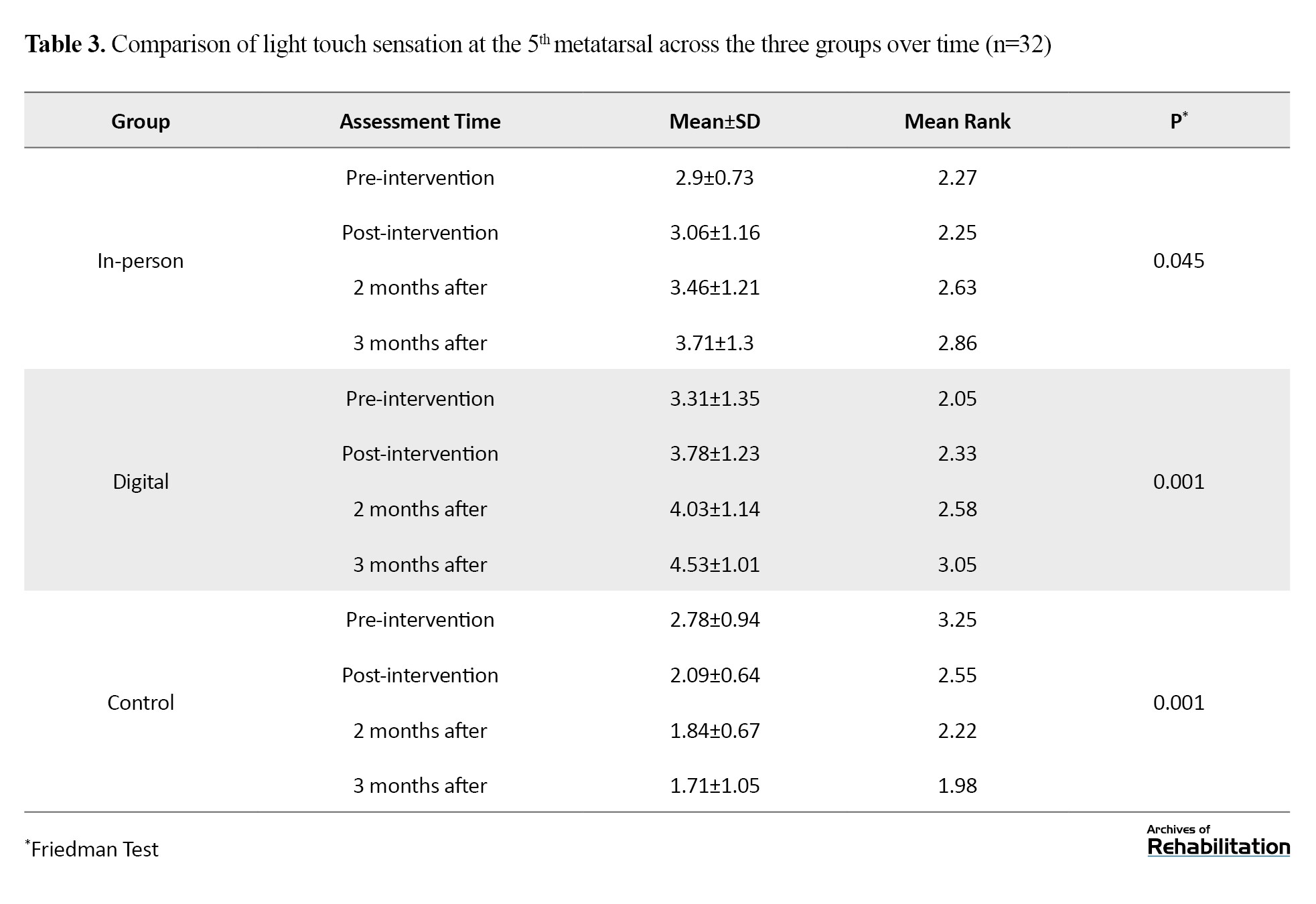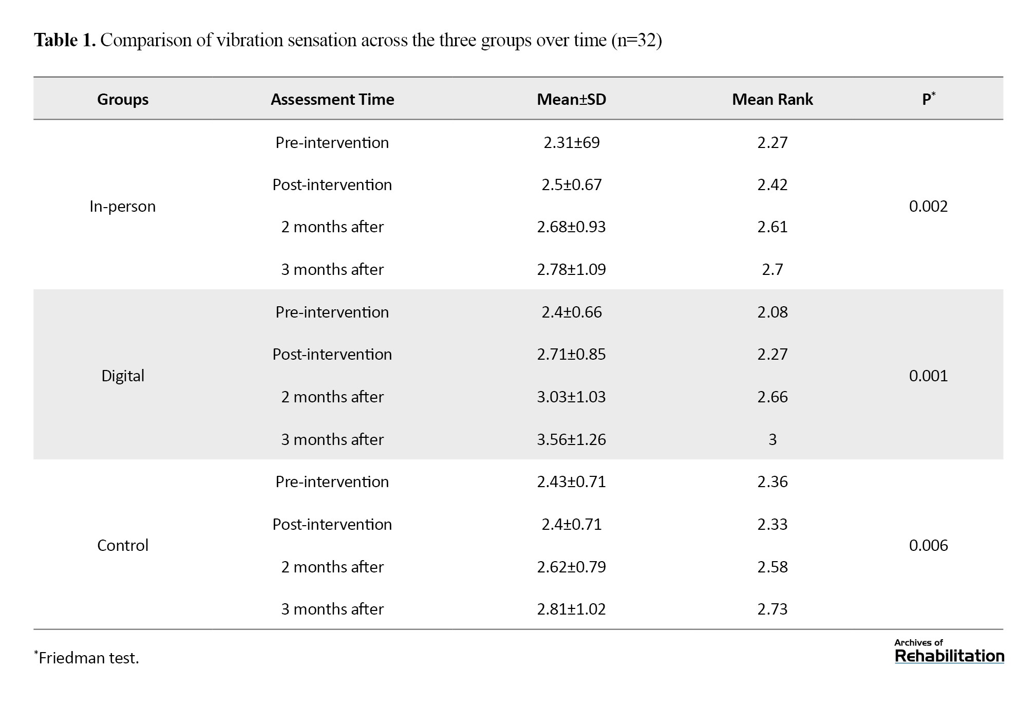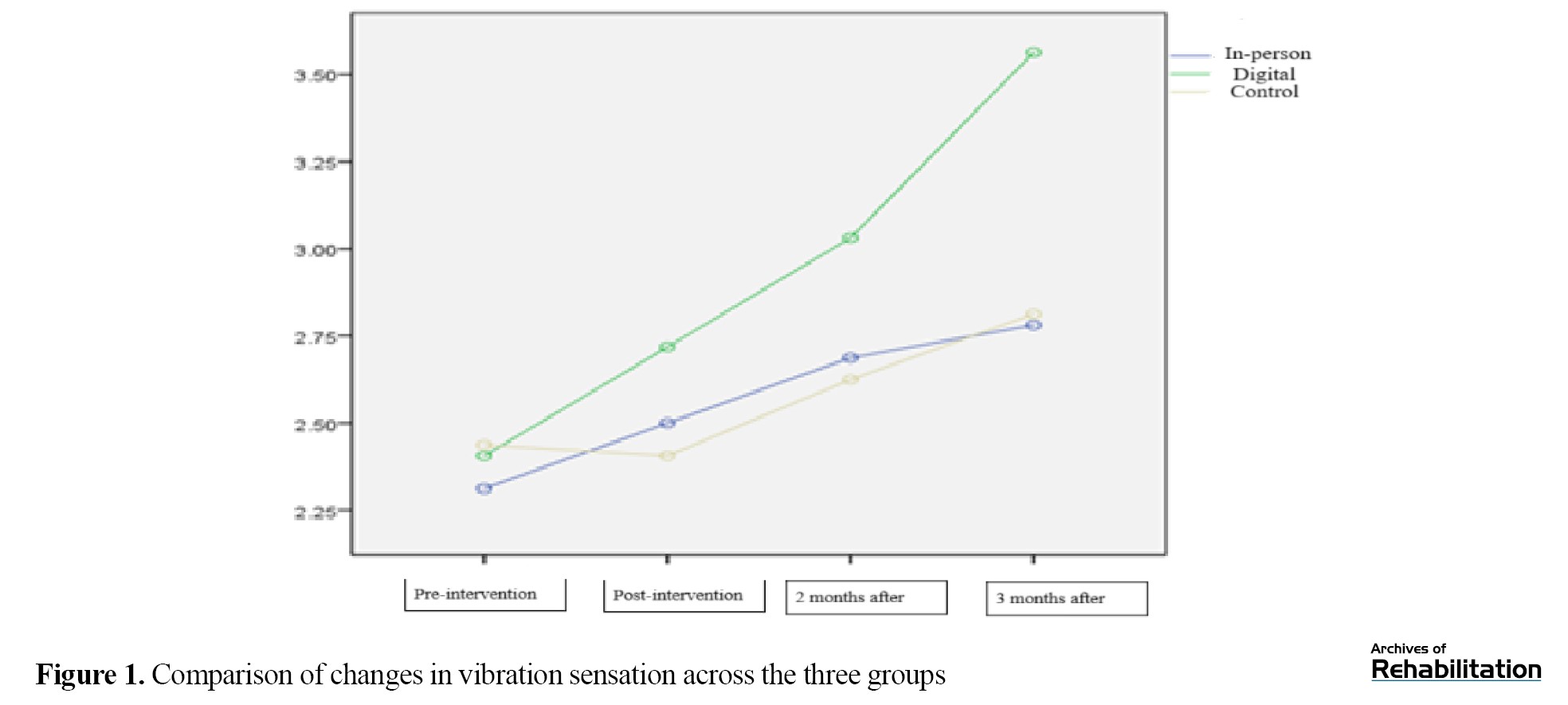 Based on the Kruskal-Wali’s test, there was no significant difference among the three groups in the pretest (P=0.750). After the intervention, both intervention groups (in-person and digital) showed a significant improvement in vibration sensation (P≤0.002), while the control group showed a significant decline (P=0.006). In comparing the groups, the digital intervention led to an increase of 0.359 units and the in-person intervention led to an increase of 0.021 units in vibration sensation. Although the difference between the two intervention groups was not statistically significant (P=0.114), the digital group showed the greatest improvement, and this improvement remained stable up to 3 months after the intervention (