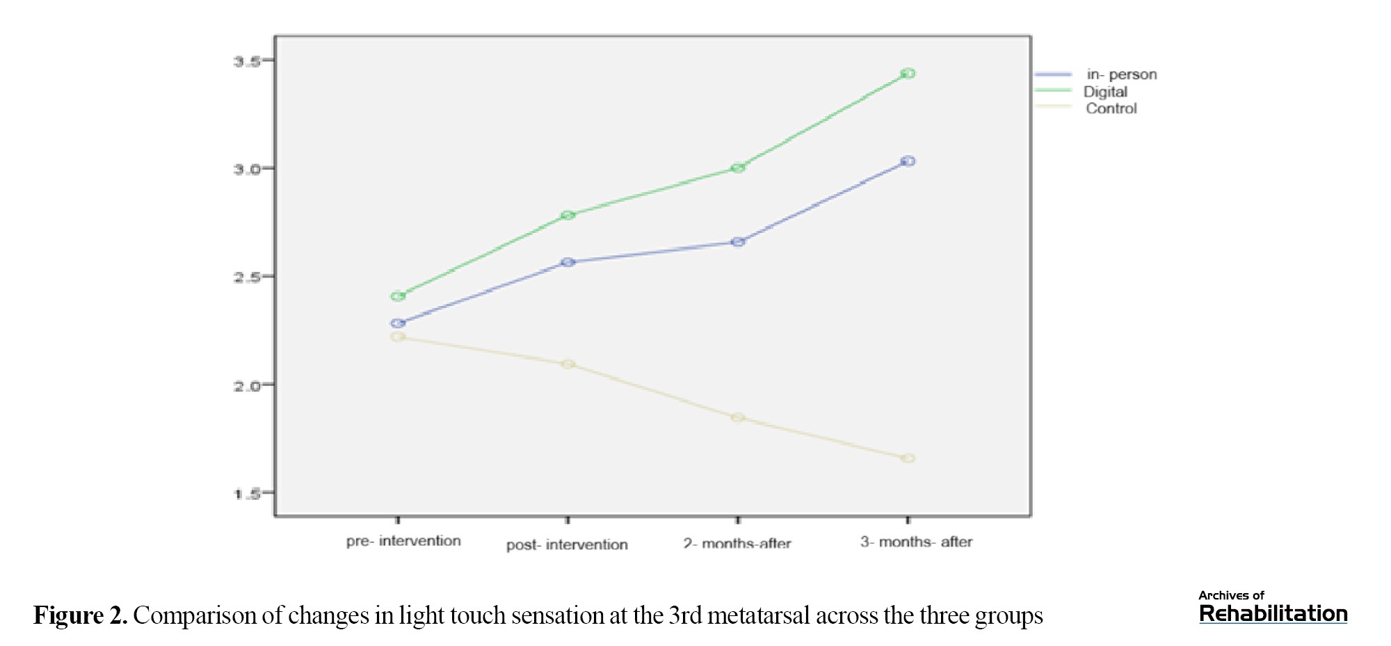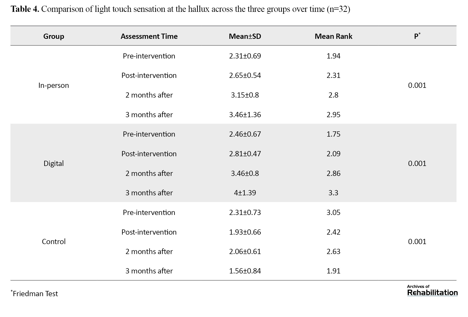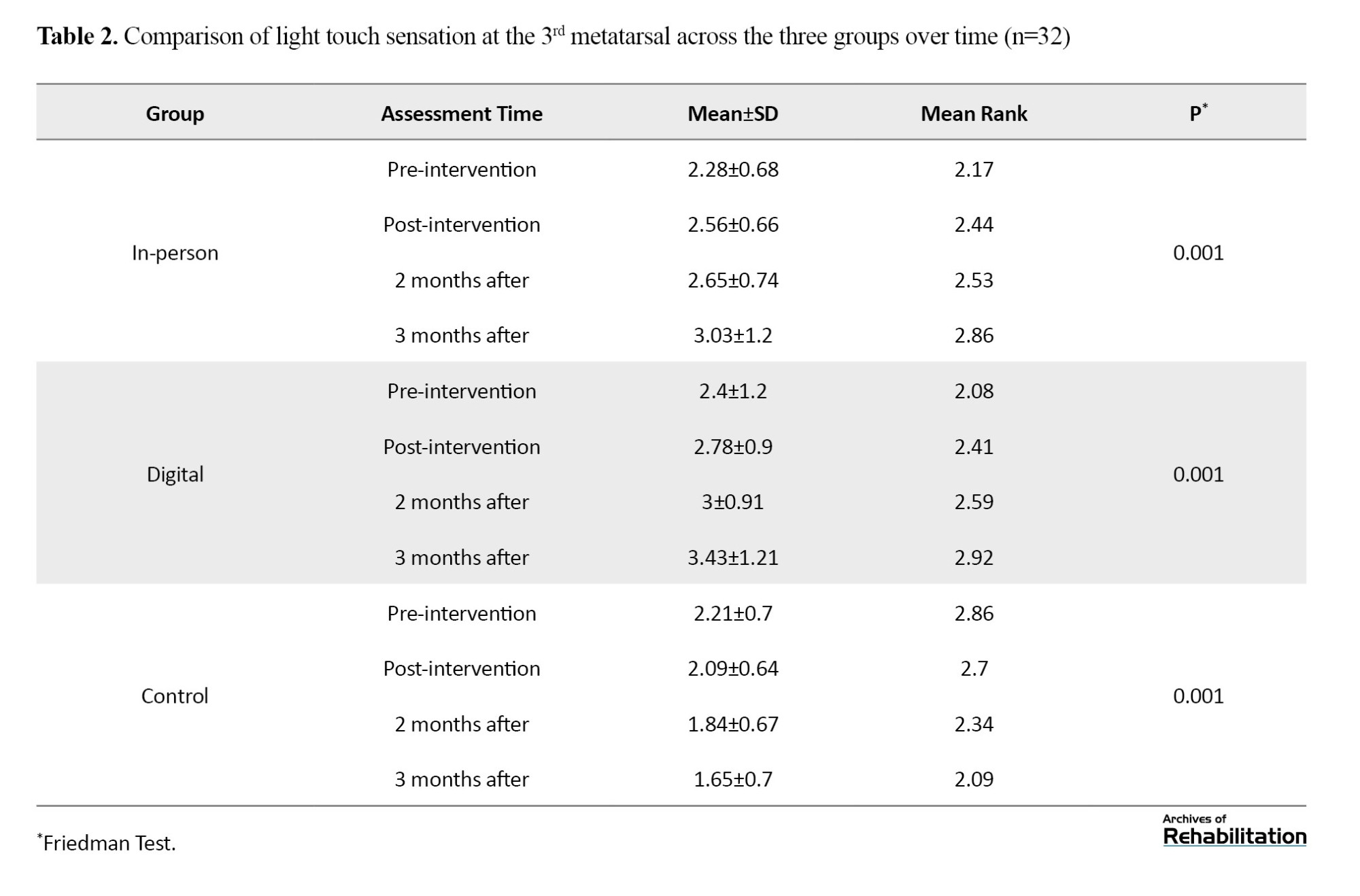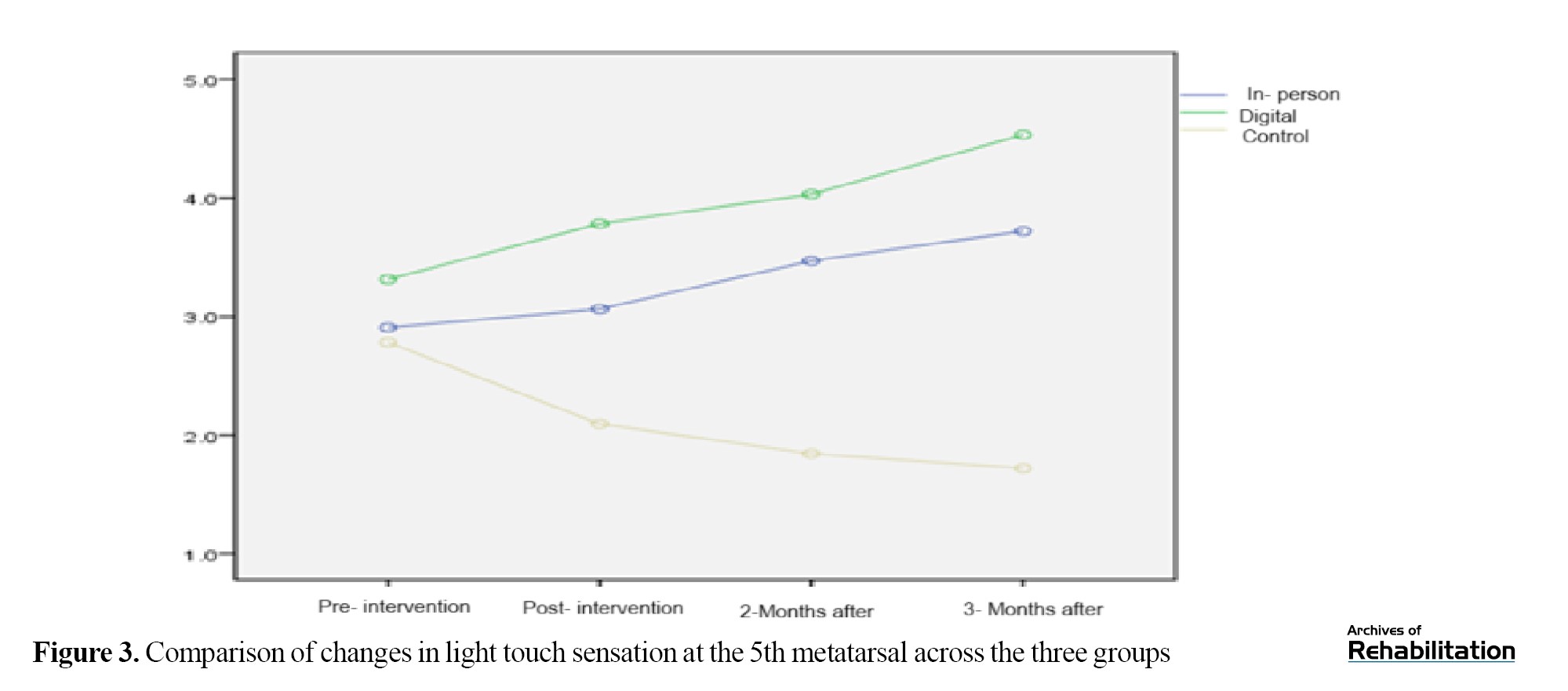 Based on the Kruskal-Wali’s test, there was no significant difference among the three groups in the pretest (P=0.750). After the intervention, both intervention groups (in-person and digital) showed a significant improvement in vibration sensation (P≤0.002), while the control group showed a significant decline (P=0.006). In comparing the groups, the digital intervention led to an increase of 0.359 units and the in-person intervention led to an increase of 0.021 units in vibration sensation. Although the difference between the two intervention groups was not statistically significant (P=0.114), the digital group showed the greatest improvement, and this improvement remained stable up to 3 months after the intervention (