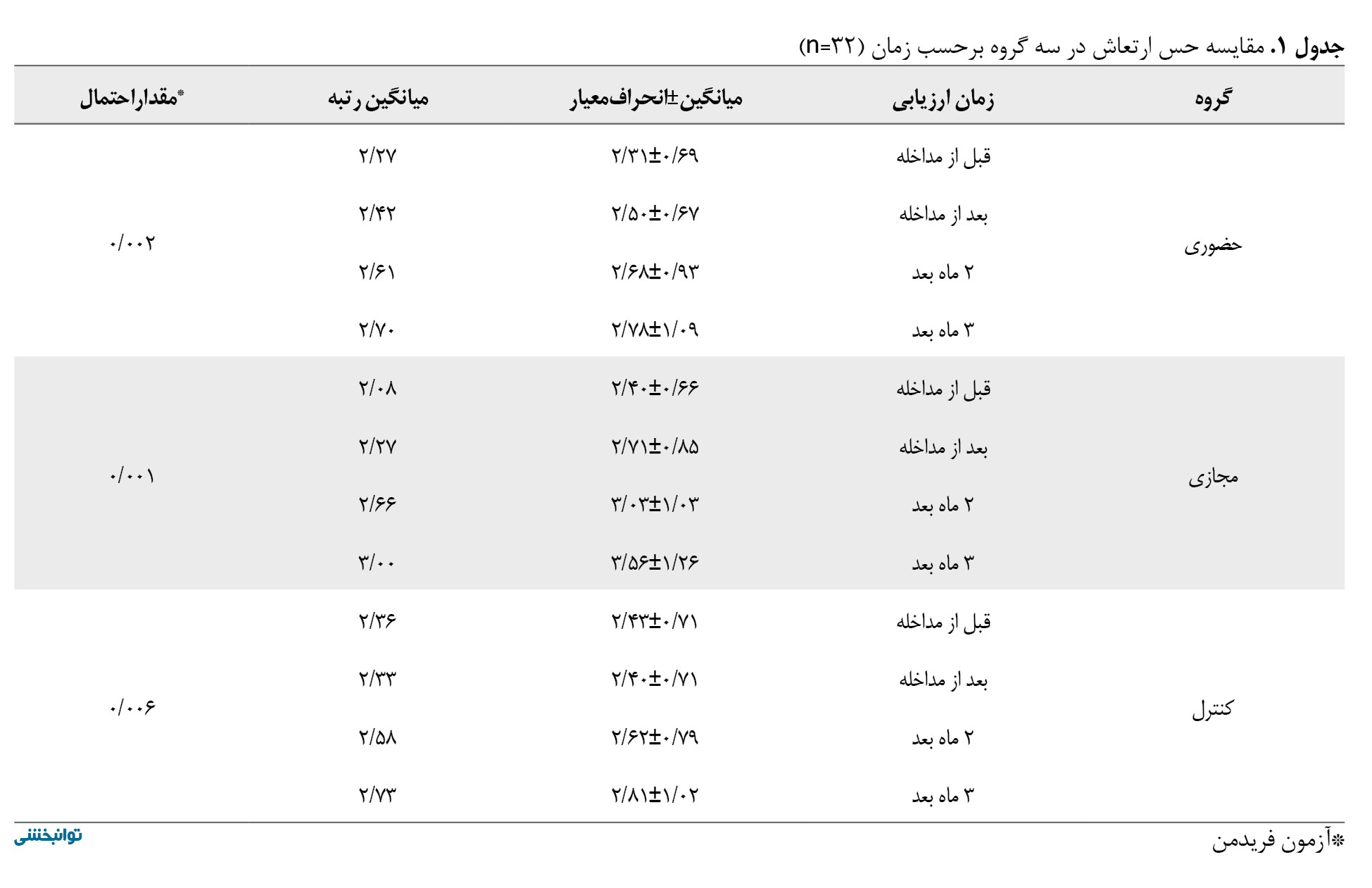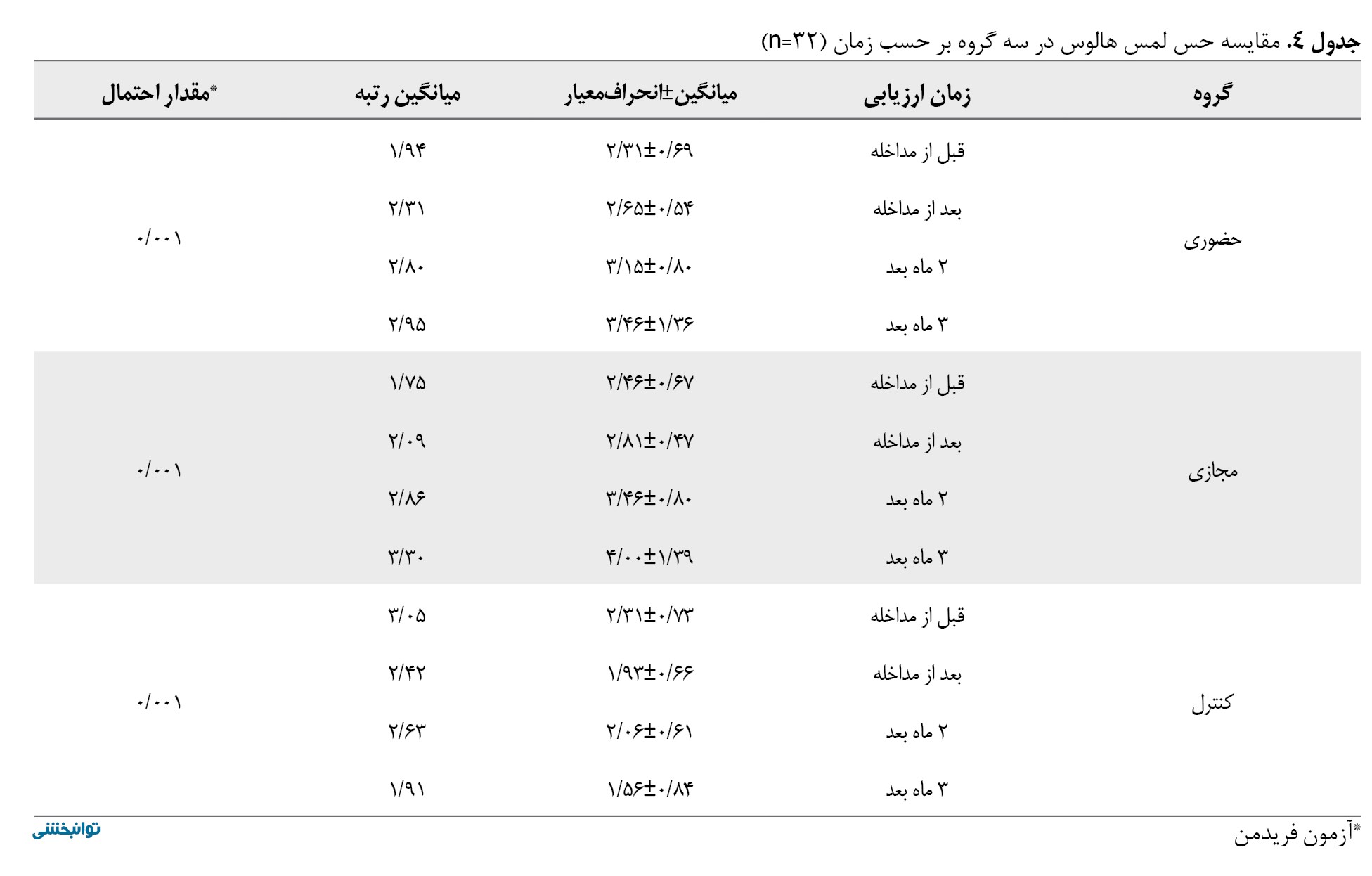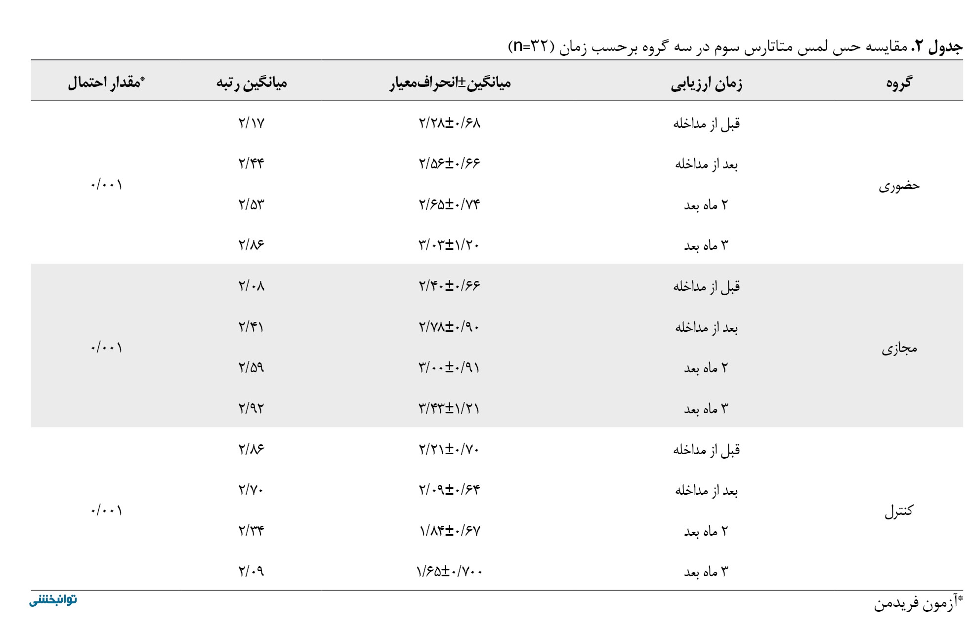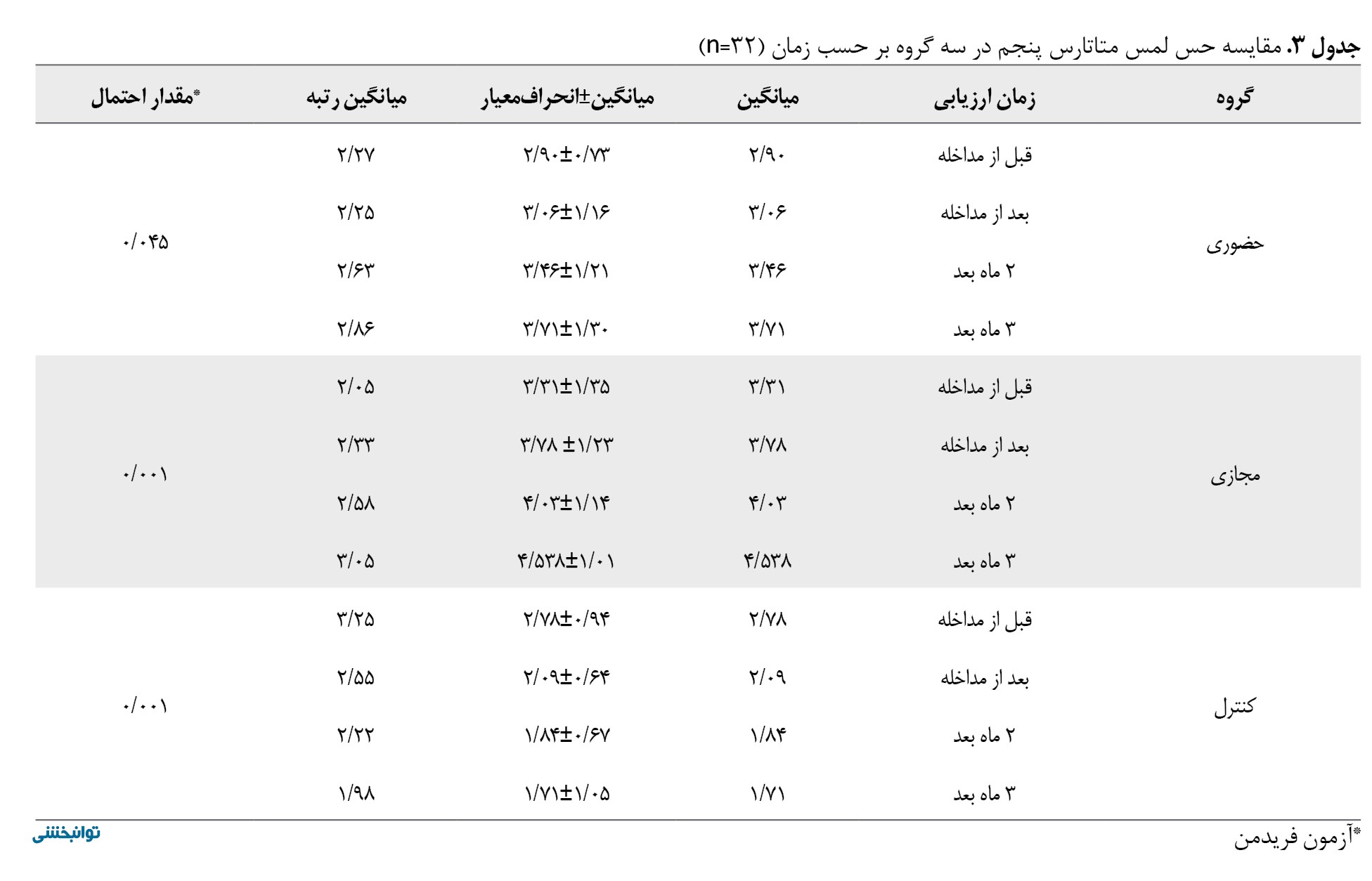 براساس آزمون کروسکال والیس، در پیشآزمون بین سه گروه تفاوت معنیداری نداشت. (0/750=P) پس از مداخله، هر دو گروه مداخله (حضوری و مجازی) بهبود معنیداری در حس ارتعاش نشان دادند (0/002≥P)، درحالیکه در گروه کنترل کاهش معنیداری مشاهده شد (0/006=P) در مقایسه بین گروهها، مداخله مجازی به افزایش 0/359 واحدی و مداخله حضوری به افزایش 0/021 واحدی در حس ارتعاش منجر شد. اگرچه تفاوت بین دو گروه مداخله ازنظر آماری معنیدار نبود (0/114=P)، اما گروه مجازی بیشترین بهبود را نشان داد و این بهبود تا 3 ماه پس از مداخله پایدار ماند (