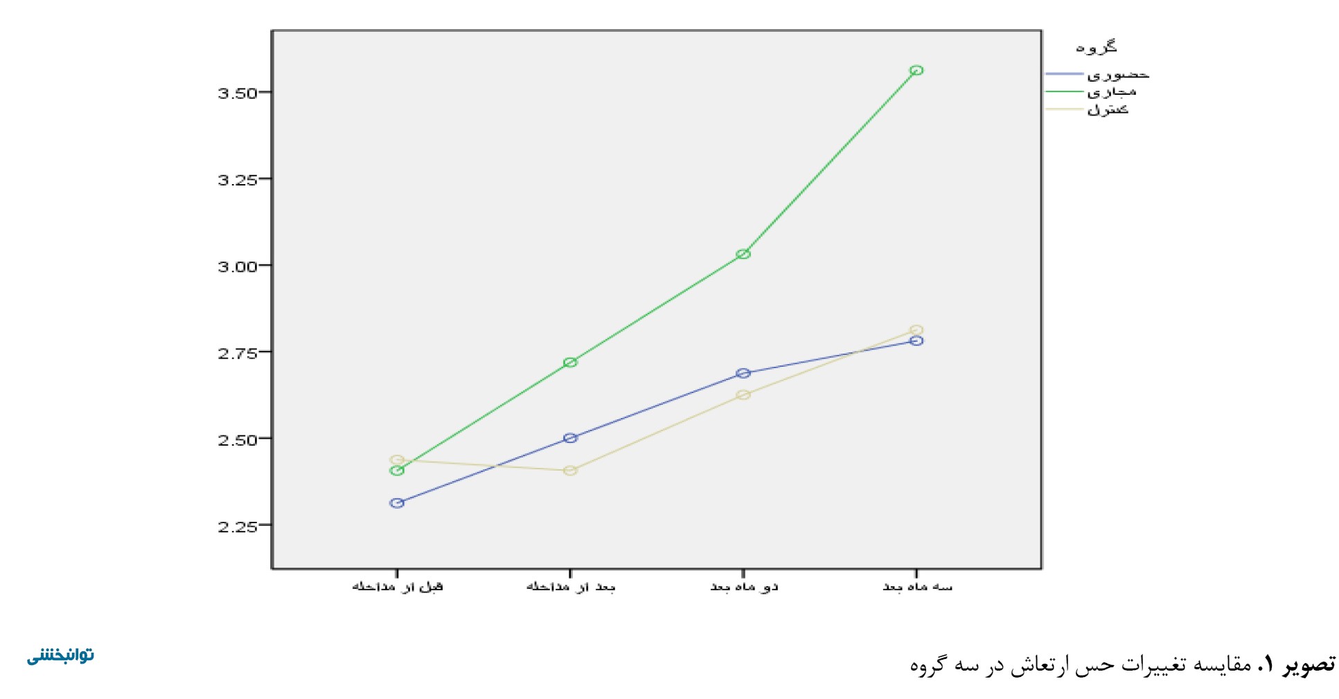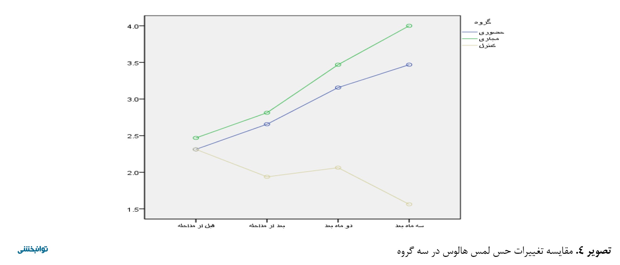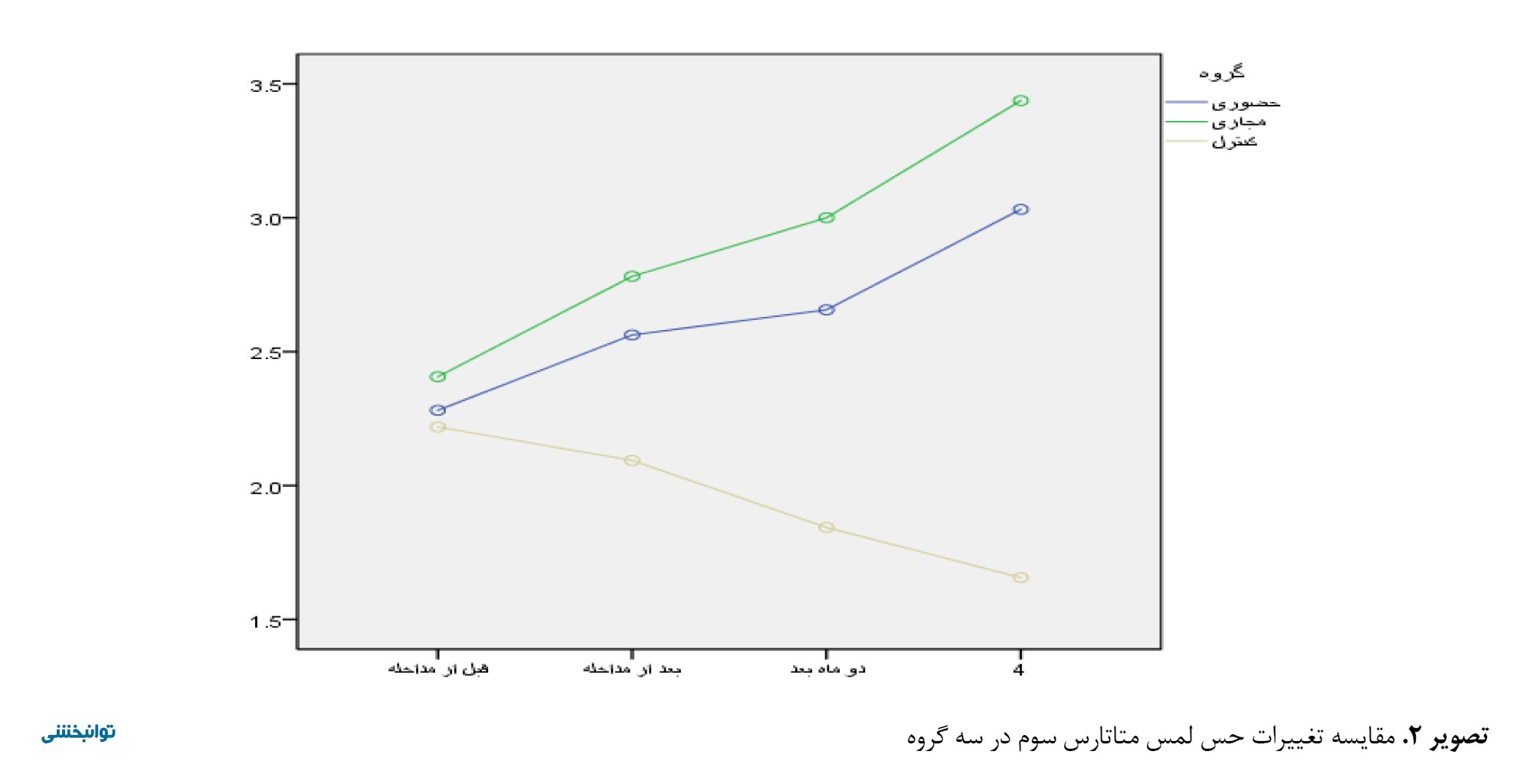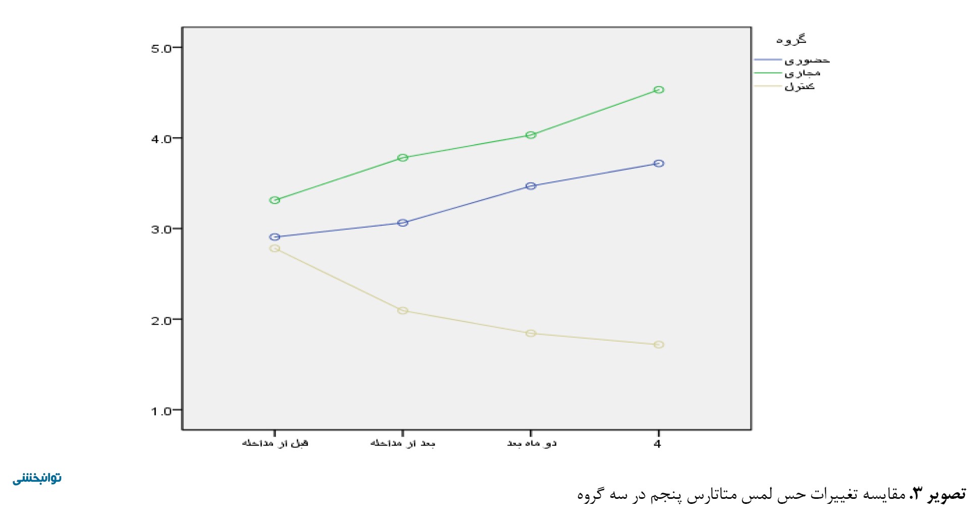 براساس آزمون کروسکال والیس، در پیشآزمون بین سه گروه تفاوت معنیداری نداشت. (0/750=P) پس از مداخله، هر دو گروه مداخله (حضوری و مجازی) بهبود معنیداری در حس ارتعاش نشان دادند (0/002≥P)، درحالیکه در گروه کنترل کاهش معنیداری مشاهده شد (0/006=P) در مقایسه بین گروهها، مداخله مجازی به افزایش 0/359 واحدی و مداخله حضوری به افزایش 0/021 واحدی در حس ارتعاش منجر شد. اگرچه تفاوت بین دو گروه مداخله ازنظر آماری معنیدار نبود (0/114=P)، اما گروه مجازی بیشترین بهبود را نشان داد و این بهبود تا 3 ماه پس از مداخله پایدار ماند (