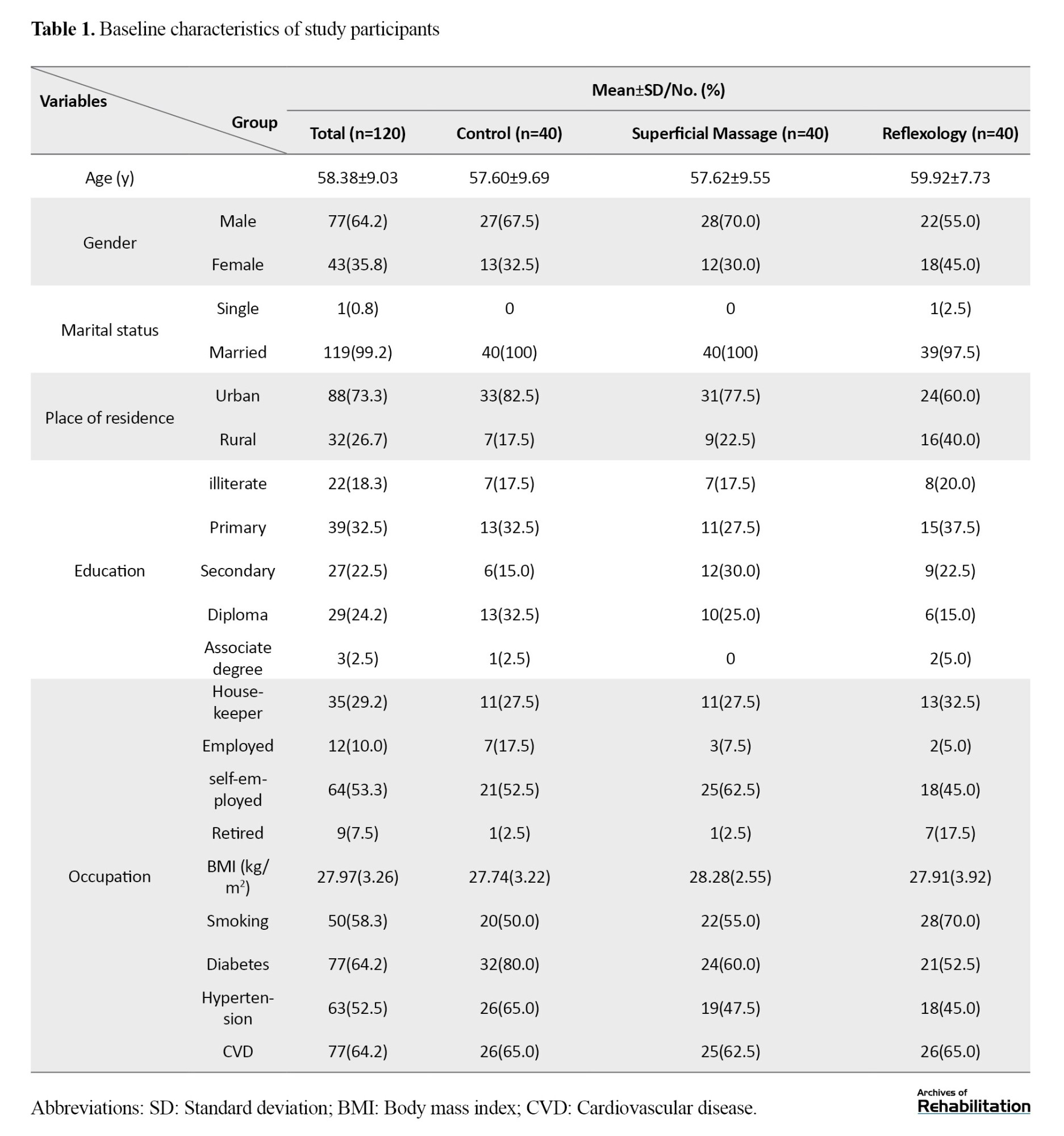 Table 1 presents the demographic and clinical features of the participants. The mean age of the patients was 58.38±9.03 years, with a mean body mass index of 27.97±3.26 kg/m². Among the participants, 64.2% were male, 99.2% were married, and 73.3% lived in urban areas. A significant proportion of the sample reported smoking (58.3%), while 53.5% were self-employed. Additionally, 64.2% had a history of diabetes mellitus, and 52.5% had a history of cardiovascular disease. Demographic and clinical characteristics were uniformly balanced across the groups.