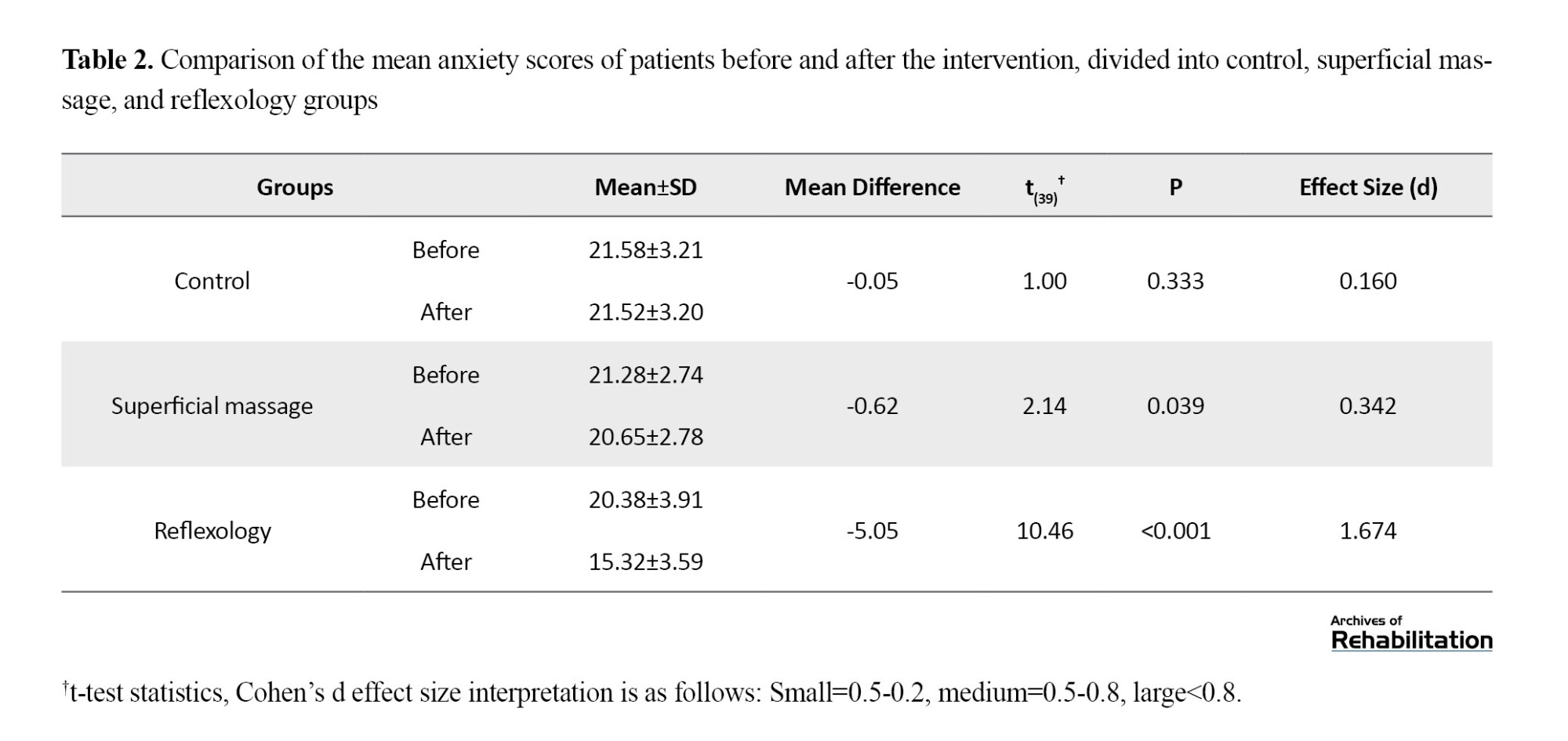 Before the intervention, a comparison of mean anxiety scores among the control, superficial foot massage, and reflexology foot massage groups revealed no significant differences. Post-intervention results showed that the mean anxiety score in the experimental group was (15.32±3.59), which marked a significant decrease from the pre-intervention mean anxiety score (20.38±3.91; d=1.674, P<0.001, t=10.46). The placebo group exhibited a similar trend, with a post-intervention mean anxiety score of (20.65±2.78), lower than the pre-intervention score of (21.28±2.74; d=0.342, P=0.039, t=2.14). In contrast, the control group showed no significant change in mean anxiety scores, with pre-intervention scores (21.58±3.21) and post-intervention scores (21.52±3.20; d=0.160, P=0.323, t=1.00). Based on Cohen’s d values, the effect size in the reflexology foot massage group was classified as high, whereas the superficial foot massage group exhibited a lower effect size (Table 2).
