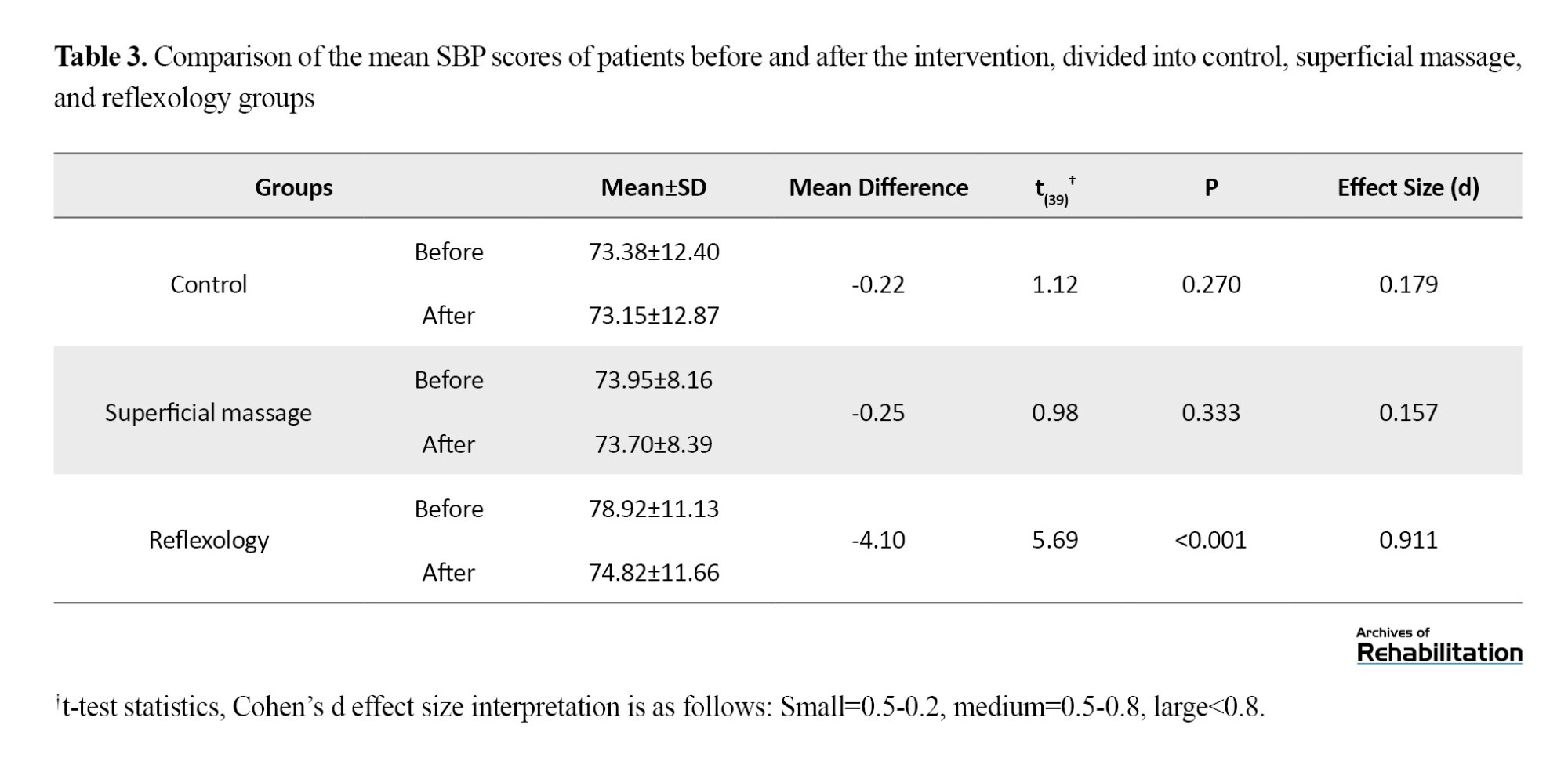 Post-intervention, the experimental group demonstrated a significant decrease in mean SBP, recorded at (121.68±15.71), compared to the pre-intervention level of (132.02±18.89) (d=1.504, P<0.001, t=9.39). The placebo group also showed a significant reduction in SBP after the intervention (125.20±14.34), compared to pre-intervention (127.22±14.12; d=0.535, P=0.002, t=3.34). However, no significant differences were seen in the control group, where SBP measurements before (119.05±17.26) and after intervention (116.72±18.15) showed no substantial change (d=0.156, P=0.336, t=0.97). The effect sizes, according to Cohen’s d values, were categorized as high and moderate for the reflexology and superficial foot massage groups, respectively. The mean DBP in the experimental group post-intervention (74.82±11.66) was significantly lower than the pre-intervention measure (78.92±11.13; d=0.911, P<0.001, t=5.69). In both the placebo and control groups, no significant changes in DBP were recorded (Table 3).