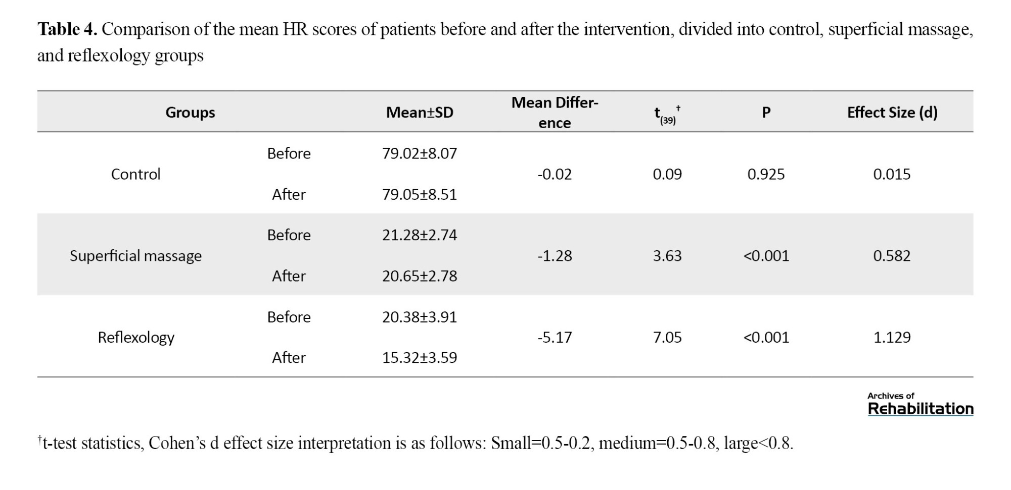 The mean pulse rate in the experimental group post-intervention (84.40±9.90) was significantly lower than pre-intervention (89.58±10.46; d=1.129, P<0.001, t=7.05). The placebo group also exhibited a significant reduction, with a post-intervention pulse rate (80.25±8.72) compared to (81.52±9.52) before the intervention (d=0.582, P<0.001, t=3.63). Conversely, no significant difference in mean pulse rate was observed in the control group (79.02±8.07 pre-intervention vs 79.05±8.51 post-intervention; d=0.015, P=0.925, t=0.09). Effect sizes, as per Cohen’s d values, were rated as high and moderate for the reflexology and superficial foot massage groups, respectively (Table 4).