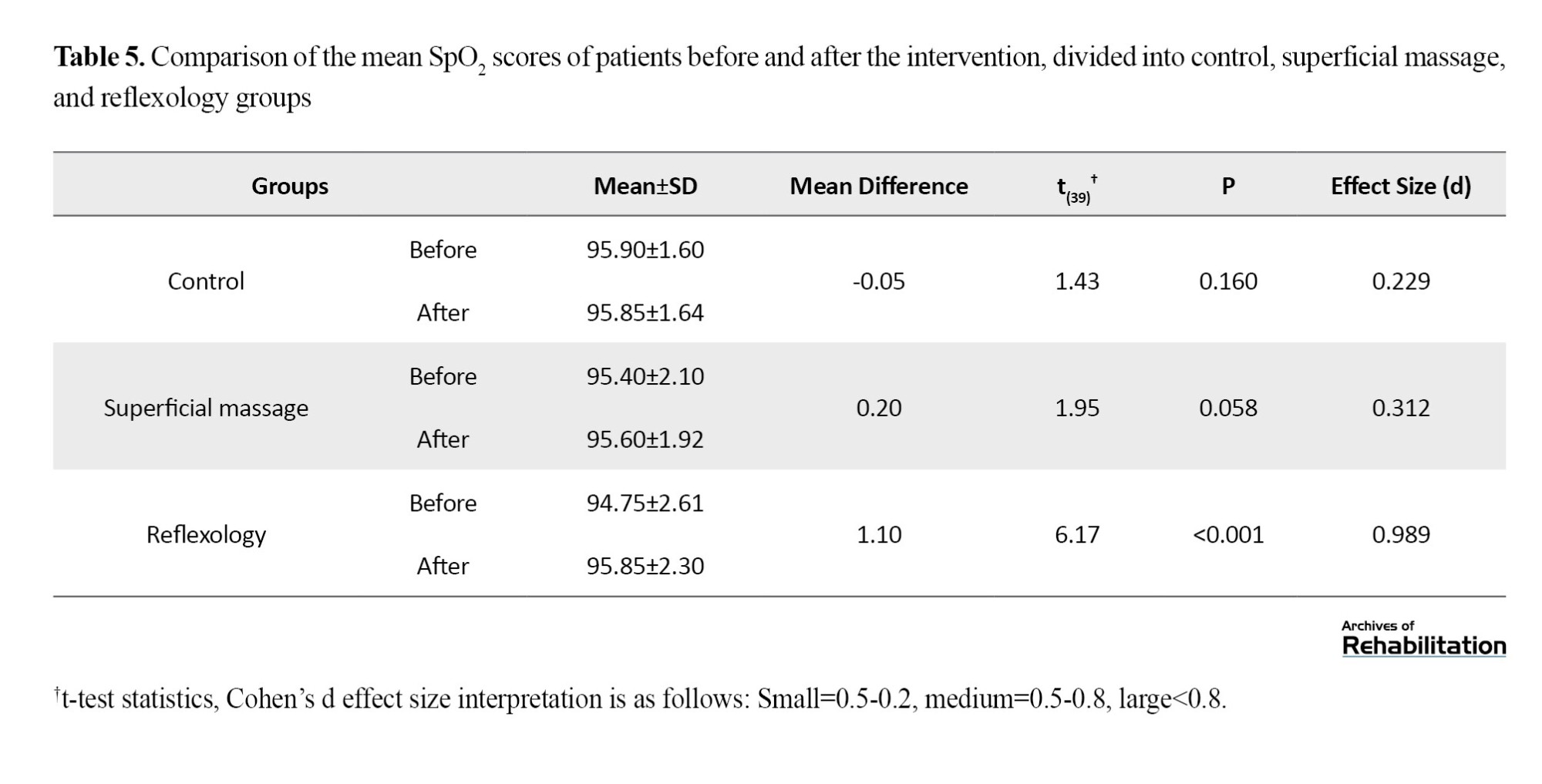 Lastly, the mean SaO2 after the intervention in the experimental group (95.85±2.30) significantly exceeded the pre-intervention measurement (94.75±2.61; d=0.989, P<0.001, t=6.17). Conversely, neither the placebo group (mean SaO2 before=95.40±2.10 vs SaO2 after=95.60±1.92) nor the control group (before=95.90±1.60 vs after=95.85±1.64) displayed significant changes in SaO2 levels (Table 5).
