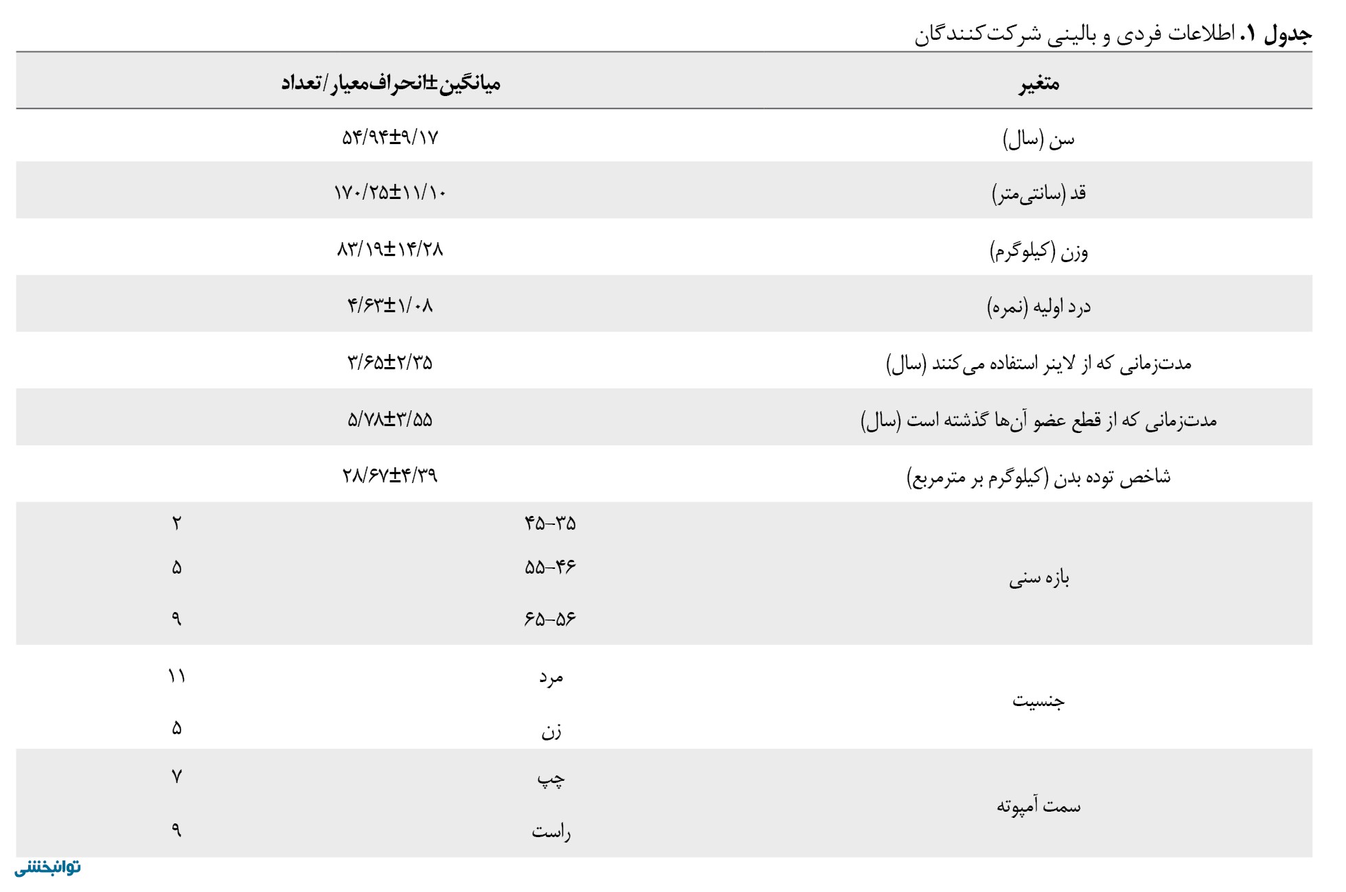 جدول شماره 1 اطلاعات شرکتکنندگان شامل درد اولیه، مدتزمان استفاده از لاینر و مدتزمانی که از قطع عضو گذشته ارائه شده است.