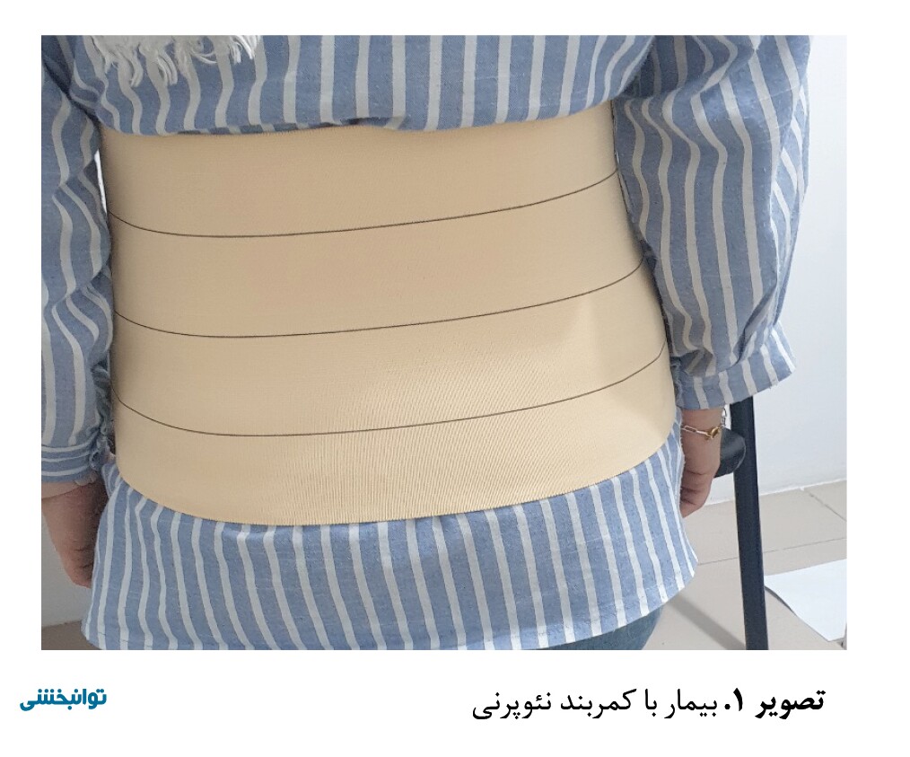 کمربند پددار که براساس سایز ثبتشده از محیط لگن در ناحیه بین خار خاصرهای قدامی-فوقانی و تروکانتر برای بیمار در نظر گرفته میشد در محل بالاتر از استخوان پوبیس برای ایشان بسته شد (تصویر شماره 1). نیروی واردشده توسط کمربند برابر با 50 نیوتون بود [25] که توسط نیروسنج کششی اندازهگیری شده و محل درست بسته شدن براساس این نیرو، روی کمربند علامتگذاری شده و از بیمار خواسته شد کمربند را در همین مکان ببندد و در صورت تغییر سایز یا وزن محسوس، آن را به ما اطلاع دهد و برای تنظیم مجدد وسیله مراجعه کند. در زمان تحویل ارتوز از بیمار خواستیم که برای 10 دقیقه با ارتوز تجویزشده در کلینیک راه برود، بایستد و بنشیند تا در صورت وجود هر گونه مشکل یا ناراحتی، آن را به ما گزارش کند و پس از اطمینان از راحتی بیمار و درک وی از نحوه استفاده، وسیله به بیمار تحویل شد. از بیمار خواسته شد در طول ۶ هفته بهصورت مداوم، در حین انجام فعالیتهای روزمره و بهمدت حداقل 8 ساعت در طی شبانهروز، از وسایل تجویزی استفاده و پس از آن مجدداً به مرکز مراجعه کند. دفترچهای دارای تاریخگذاری صفحات در اختیار بیمار قرار گرفت و از ایشان خواسته شد در هر روز، ساعات استفاده از کمربند و جمع ساعت روزانه را در آن یادداشت کند.