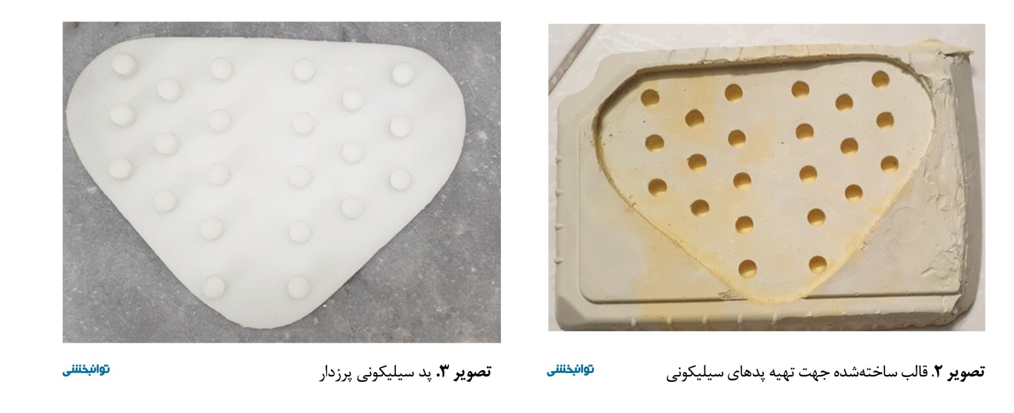 در مرحله بعد پس از خشک شدن قالب گچی و بیرون آوردن فوم از درون آن، نقاط قرارگیری پرزها به این شکل مشخص شد. ابتدا از ارتفاع مثلث به هر سمت 5/1 سانتیمتر فاصله مشخص گردید. در 3 سانتیمتر میانی سوراخگذاری برای پرز جهت آزادگذاری زوائد خاری مهرهها انجام نشد. پس از تعیین این فاصله نقاطی با فاصله مساوی 2 سانتیمتر در قالب مشخص گردید. سوراخگذاری در محل این نقاط توسط مته انجام شد (تصویر شماره 2). مته استفادهشده دارای قطر 10 میلیمتر بوده و به طول 10 میلیمتر از نوک مته با جوهر رنگآمیزی انجام شد تا ارتفاع تمام سوراخهای ایجادشده با هم یکسان باشند. پس از تعبیه سوراخها با استفاده از سیلیکون بهداشتی (از نوع RTV با ویسکوزیته پایین و شور 10 کد 3040 شرکت شیمی افسون که در دمای اتاق طی مدت 30 تا 40 دقیقه ست میشود) پدهای مثلثی تهیه گردید (تصویر شماره 3). پس از گذشت 24 ساعت و خشک شدن سیلیکون، پد خارج شده و چسب ولکرو برای اتصال با کمربند، با چسب مخصوص سیلیکون، در قسمت پشتی آن جایگذاری شد. در ادامه یک عدد کمربند به ارتفاع 28 سانتیمتر از جنس نئوپرن برای بیمار طراحی و ساخته شد و با استفاده از چسب ولکرو به پد سیلیکونی دارای برجستگی متصل گردید.