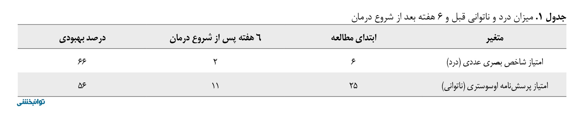 بیمار پس از 6 هفته استفاده از مداخله مدنظر، مجدداً به مرکز ما بازگشت و برای بار دوم مقیاس شاخص بصری عددی و پرسشنامه اوسوستری را تکمیل کرد. در این مرحله از بیمار خواستیم میزان رضایت خود از درمان انجامشده را بیان کند.
