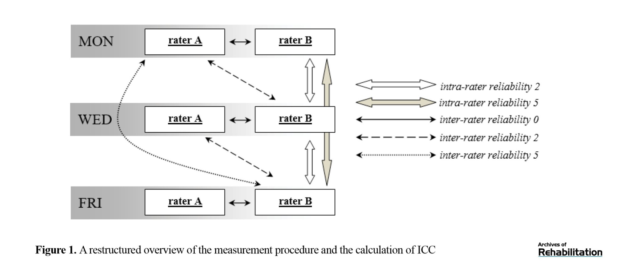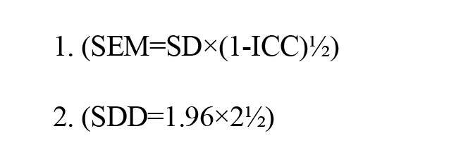 For the calculation of ICC, a mixed-model analysis of variance was used, where the repeated factor was the consecutive measurements and the independent factor was the subjects. The reliability of the same-day measurements conducted by a single rater is not reported separately, as it is inherently encompassed within other forms of intra-rater reliability (Figure 1). In Model 2, k of the ICC was applied to allow for generalization into the whole population of similar raters. The ICCs were separately calculated for the results of a single repetition of the given muscle length test, two repetitions (mean value), and three repetitions (mean value). Additionally, standard errors of measurement (SEM) were calculated using the Equation 1, along with the smallest detectable differences (Equation 2). Interpretation of the reliability of ICCs values was as follows: Poor=0.00-0.50; moderate=0.50-0.75; good=0.75-0.90; and excellent=0.90-1.00 [37].
