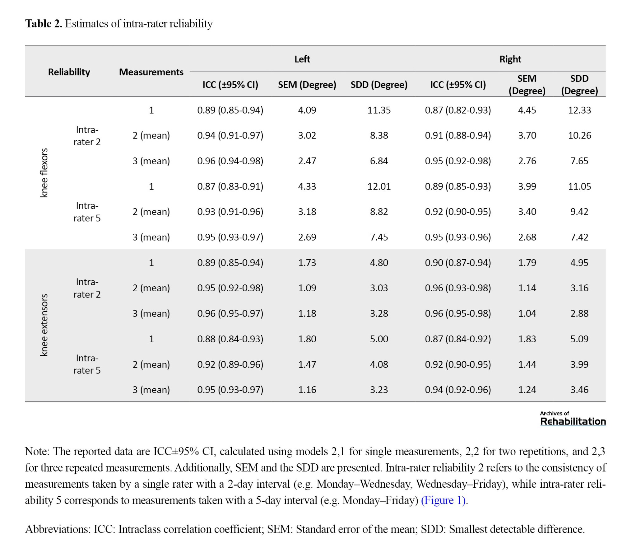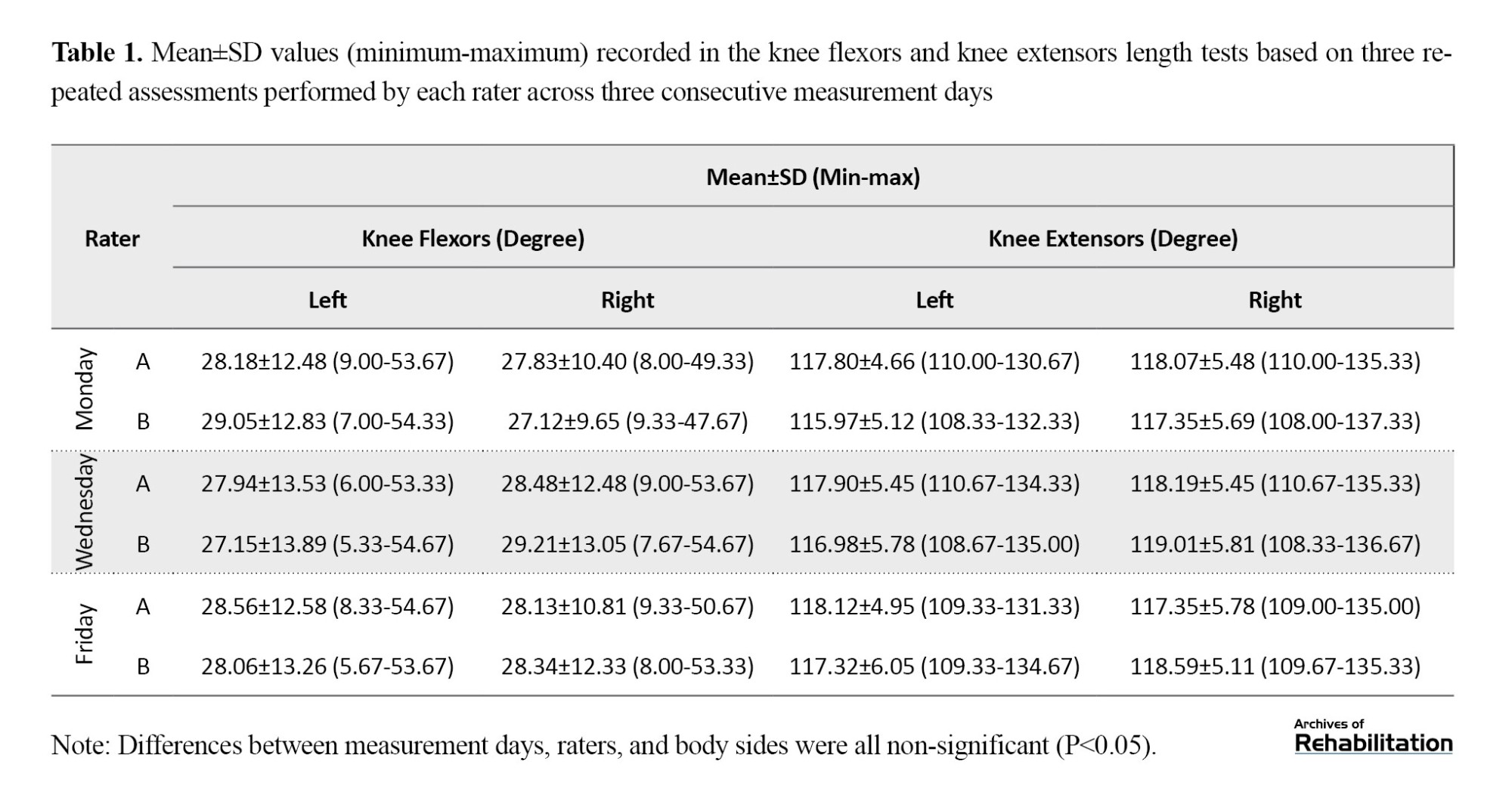 - Norris CM, Matthews M. Inter-tester reliability of a self-monitored active knee extension test. Journal of Bodywork and Movement Therapies. 2005; 9(4):256-9. [DOI:10.1016/j.jbmt.2005.06.002]