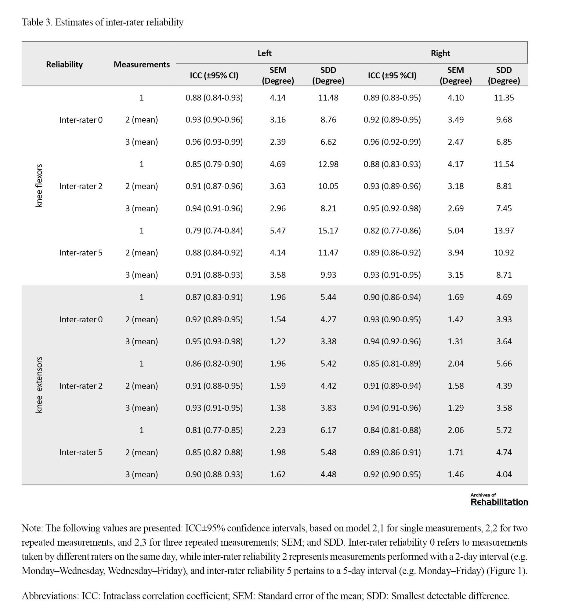 In terms of absolute reliability, our SDD for three repeated measurements was a maximum of 9.93 degrees for the knee flexors and 4.48 degrees for the knee extensors. While the clinical or scientific implications of these values depend on the context, we observed that the differences between raters or on different days were smaller than the SDDs, suggesting that the measurements remained stable and consistent over time. This highlights the robustness of our modified procedures and supports their use for reliable clinical and scientific assessments.