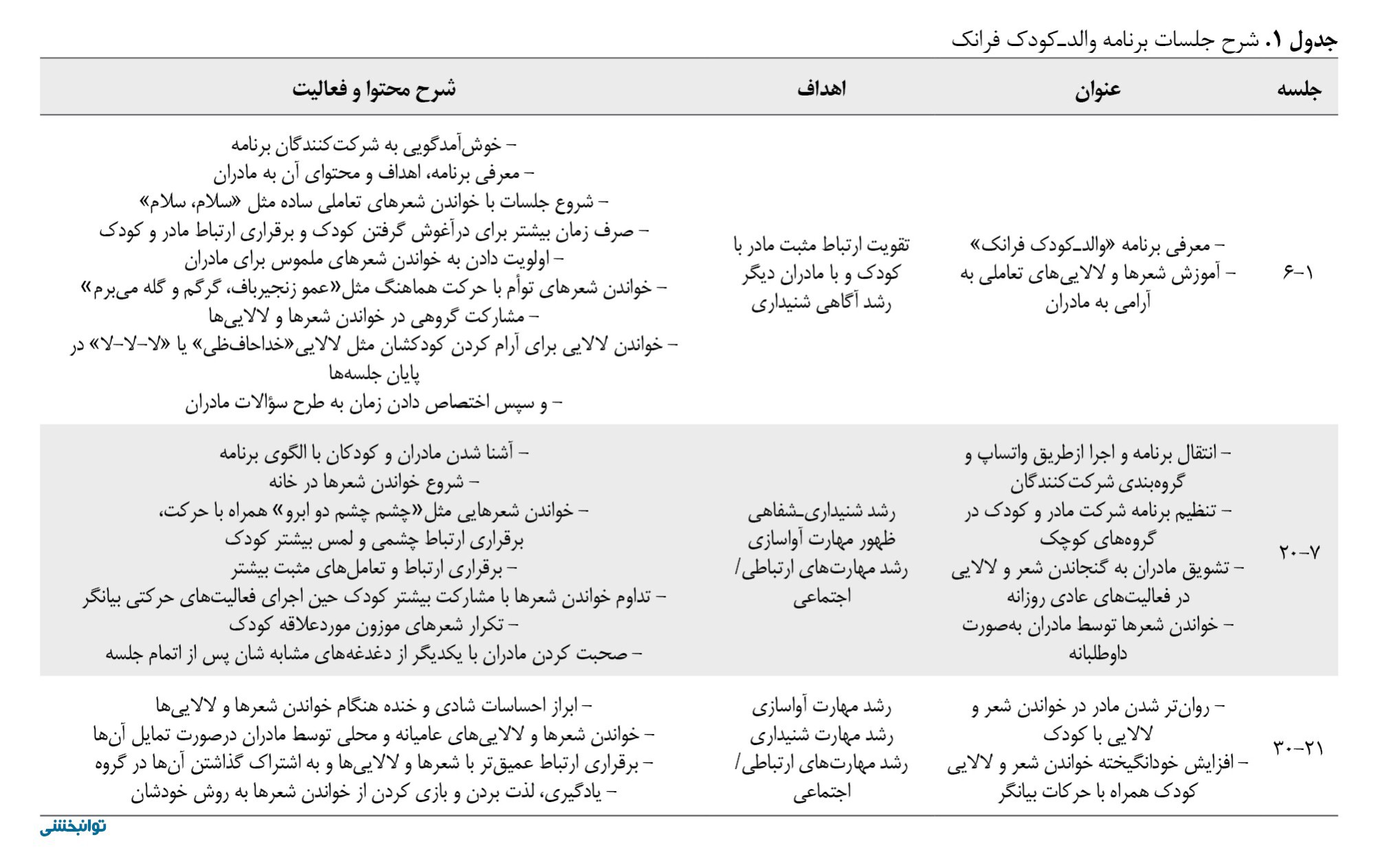 جستوجوی انجامشده در بانکهای اطلاعاتی مختلف نشان داد تاکنون پژوهش منتشرشدهای که اثربخشی برنامه مامان غازه یا فرانک را بر رشد مهارتهای مرحله پیشزبانی: شنیداری و آواسازی کودکان کمشنوا و ناشنوا سنجیده باشد، یافت نشد، امّا پژوهشهایی وجود دارند که اثربخشی برنامه فرانک یا مامان غازه را بر مهارتهای زبانی (زبان دریافتی و بیانی) ترت و همکاران [21]، شارف [23] و عزیززاده-پریخانی و همکاران [16] و مهارتهای سوادآموزی اسنودون [24] بررسی کردهاند. در همه این پژوهشها از شعر و لالایی بهعنوان روشی برای برقراری ارتباط بهتر والدین با کودک کمشنوا و ناشنوا استفاده شده است. نتایج پژوهشهای فوق نشانگر تأثیر این برنامه بر تسهیل رشد زبان در سالهای اولیه کودکی میباشد که پایه رشد مهارتهای سوادآموزی است. برایمثال اسنودن [24] در پژوهش خود با والدین شنوای نوزادان ناشنوا در برنامه والدـکودک مامان غازه مصاحبه کرد و والدین گزارش کردند وقتی نوزادان درمعرض شعرهای آهنگین و موزون همراه با اشارههای زبان آمریکایی قرار گرفتند، تغییرات فوری را در رفتار نوزاد خود همچون حرکات دست، حالتهای چهره، خندیدن و غان و غون مشاهده کردند [24].