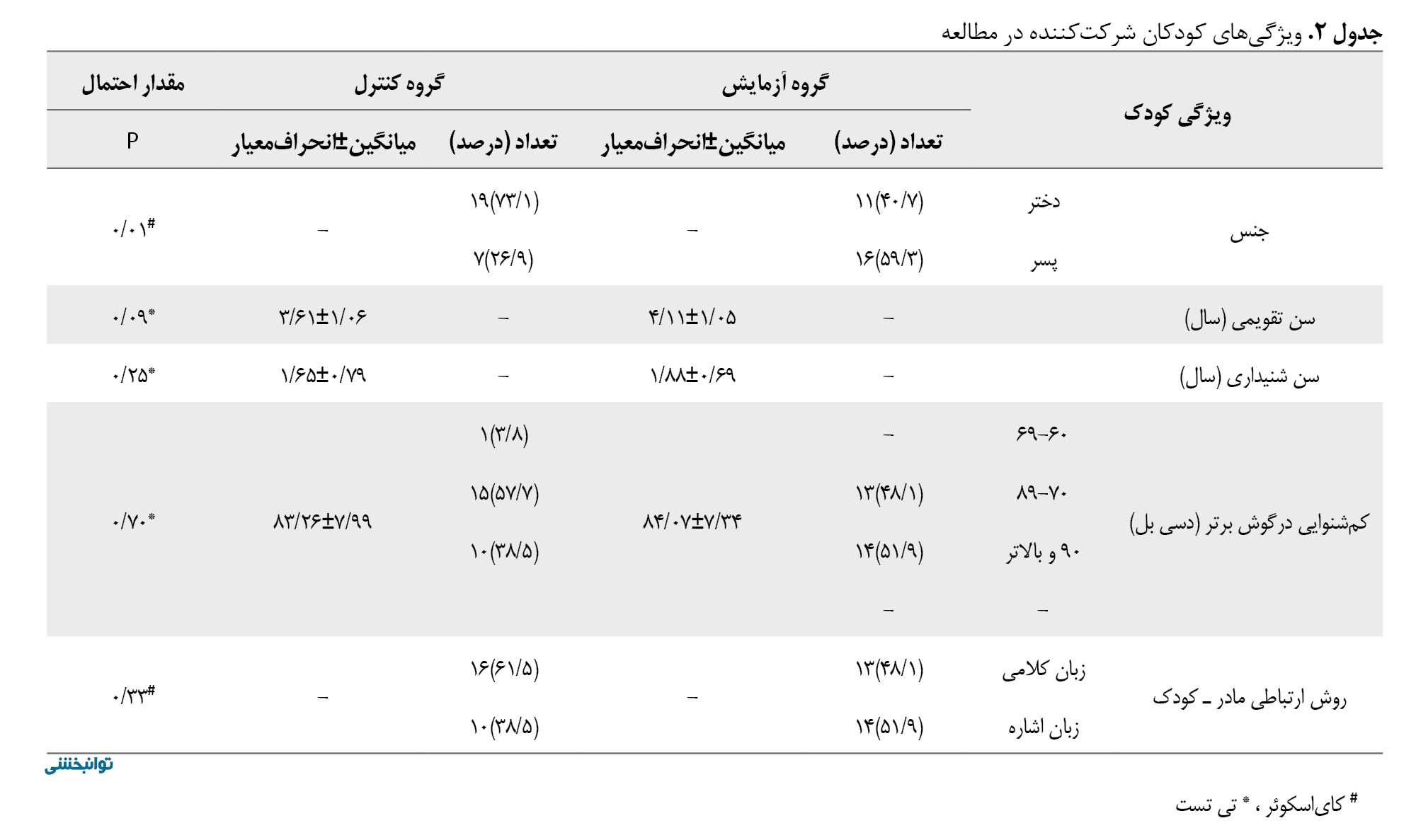 همانگونه که در جدول شماره 2 مشاهده میشود تقریباً همه کودکان دارای کمشنوایی شدید یا عمیق بودند. اختلاف معنیدار آماری بین سن تقویمی و سن شنیداری کودکان و همچنین روش برقراری ارتباط بین مادر و کودک (کلامی/اشاره) وجود نداشت (P>0/05). ترکیب جنسی کودکان در دو گروه آزمایش و کنترل تفاوت معنیدار داشت (P=0/01). همه کودکان از وسیله کمک شنیداری استفاده میکردند. کلیه متغیرها از توزیع نرمال برخوردار بودند. قبل از انجام تحلیل واریانس اندازه گیری مکرر، کرویت تغییرات ایجادشده درون آزمودنی و بین آزمودنی با استفاده از آزمون گرین هاوس گیسر تأیید شد.