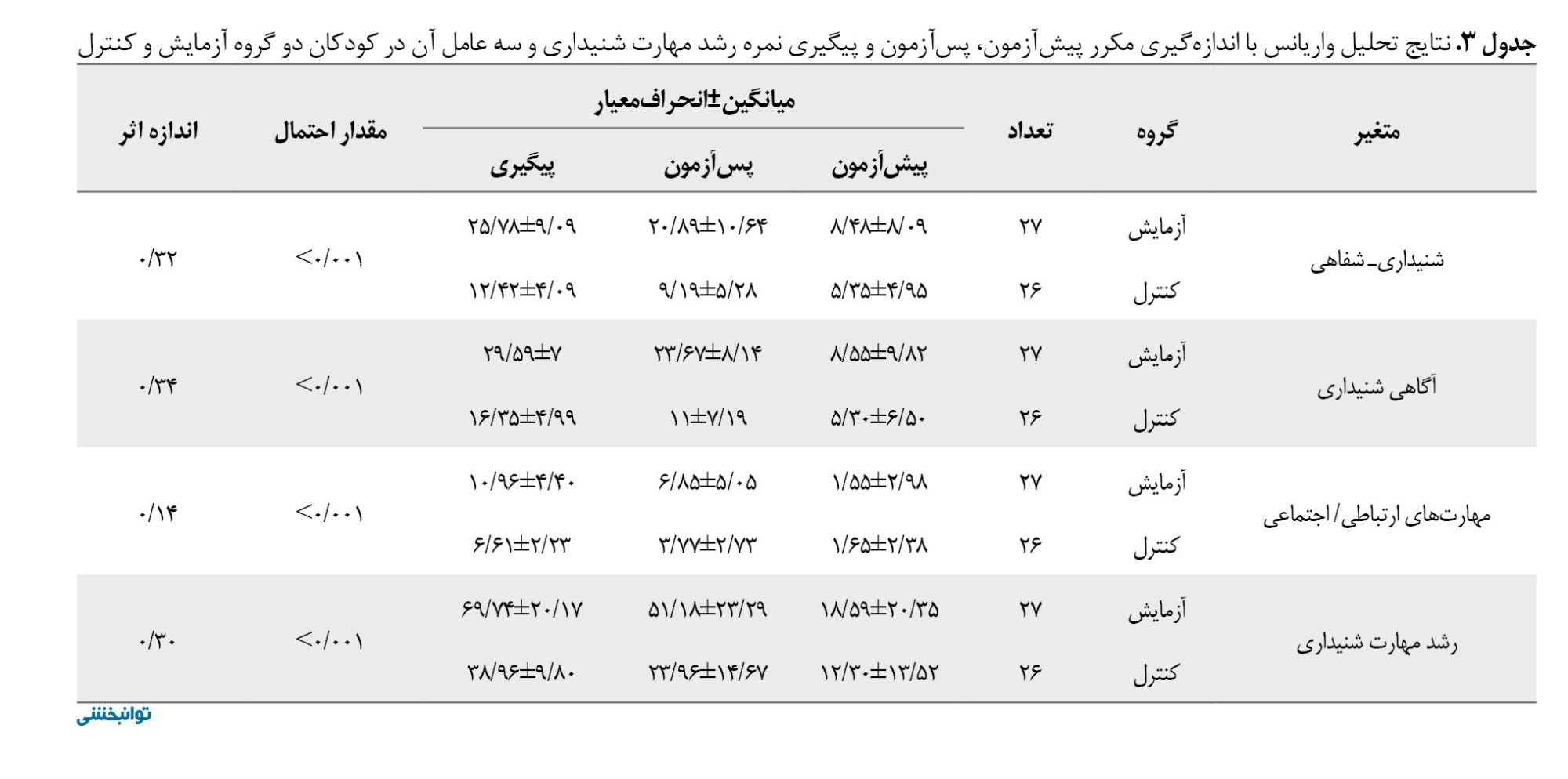 جدول شماره 3، نتایج تحلیل واریانس با اندازههای مکرر را جهت مقایسه اندازه اثر و میانگین نمره رشد مهارت شنیداری و سه عامل آن در کودکان دو گروه آزمایش و کنترل در سه سنجش پیشآزمون، پسآزمون و پیگیری نشان میدهد.