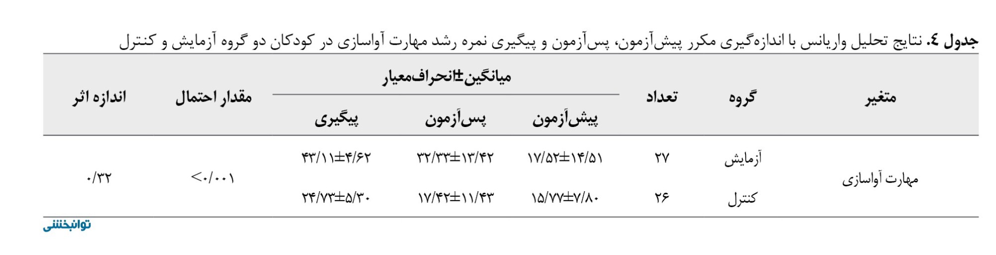 همچنین براساس مجذور ضریب اتا، 32 درصد از تغییرات بین نمرات رشد مهارت آواسازی کودکان دو گروه مربوط به مداخله میباشد (جدول شماره 4).