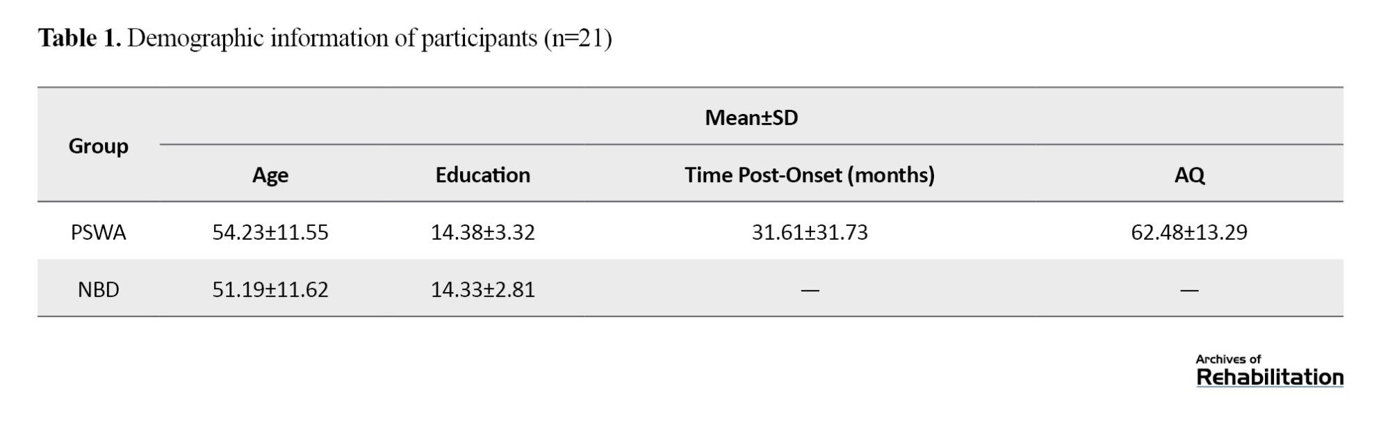 Ultimately, 42 participants were included in the study, divided into two groups: the first group consisted of 21 PSWA (9 women and 12 men), and the second group comprised 21 NBD adults (10 women and 11 men). The control group was matched with the aphasic group in terms of gender, age, and educational background (although perfect matching was not fully achieved) and had no neurological or psychiatric conditions that could affect language abilities. These individuals also demonstrated normal vision, hearing, and cognitive functioning. A demographic questionnaire, completed by the participants themselves, confirmed their medical history and general health status. All participants signed a written informed consent form.